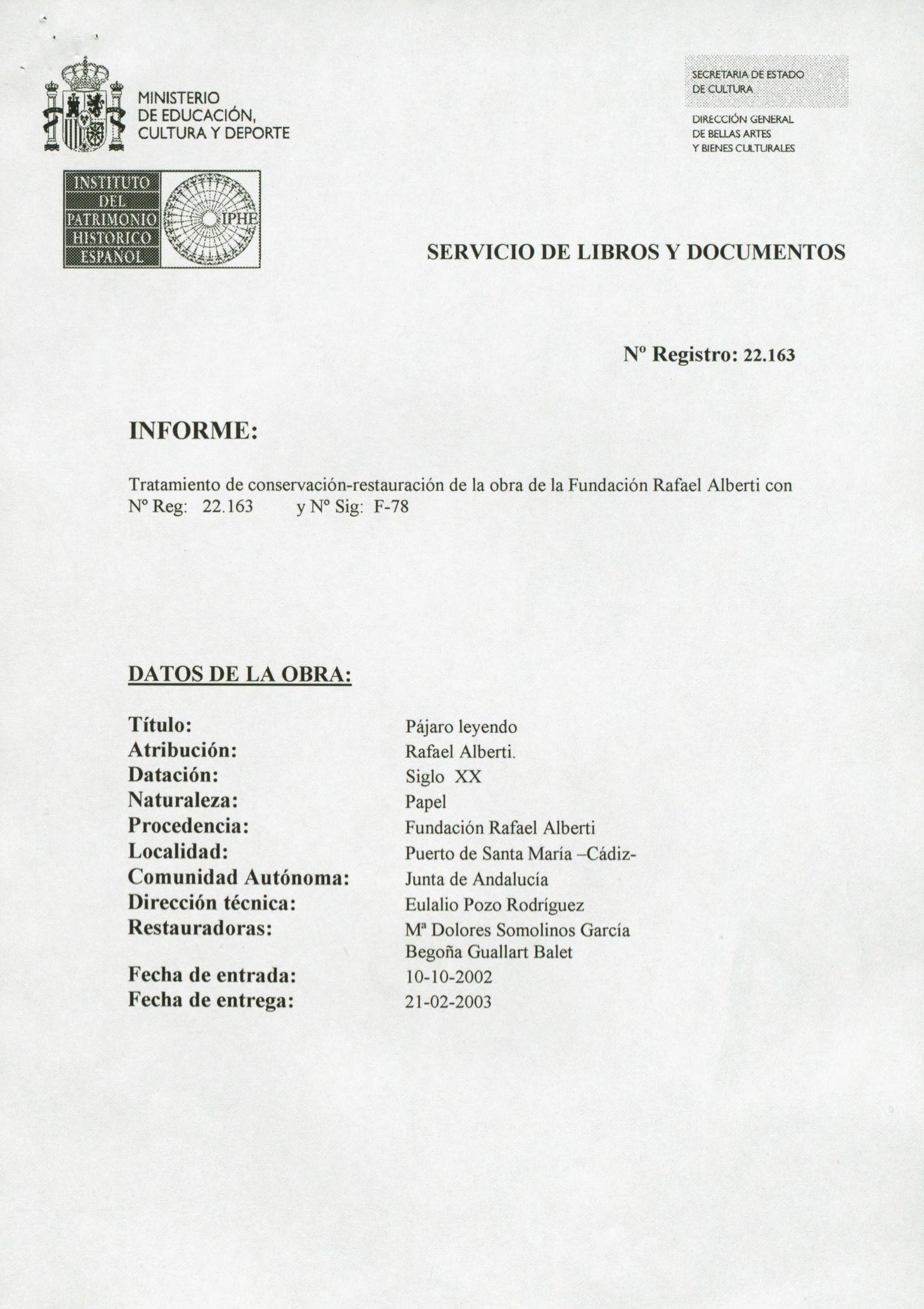 Restauración de la obra gráfica "Pájaro leyendo", procedente de la Fundación Rafael Alberti en El Puerto de Santa María (Cádiz)