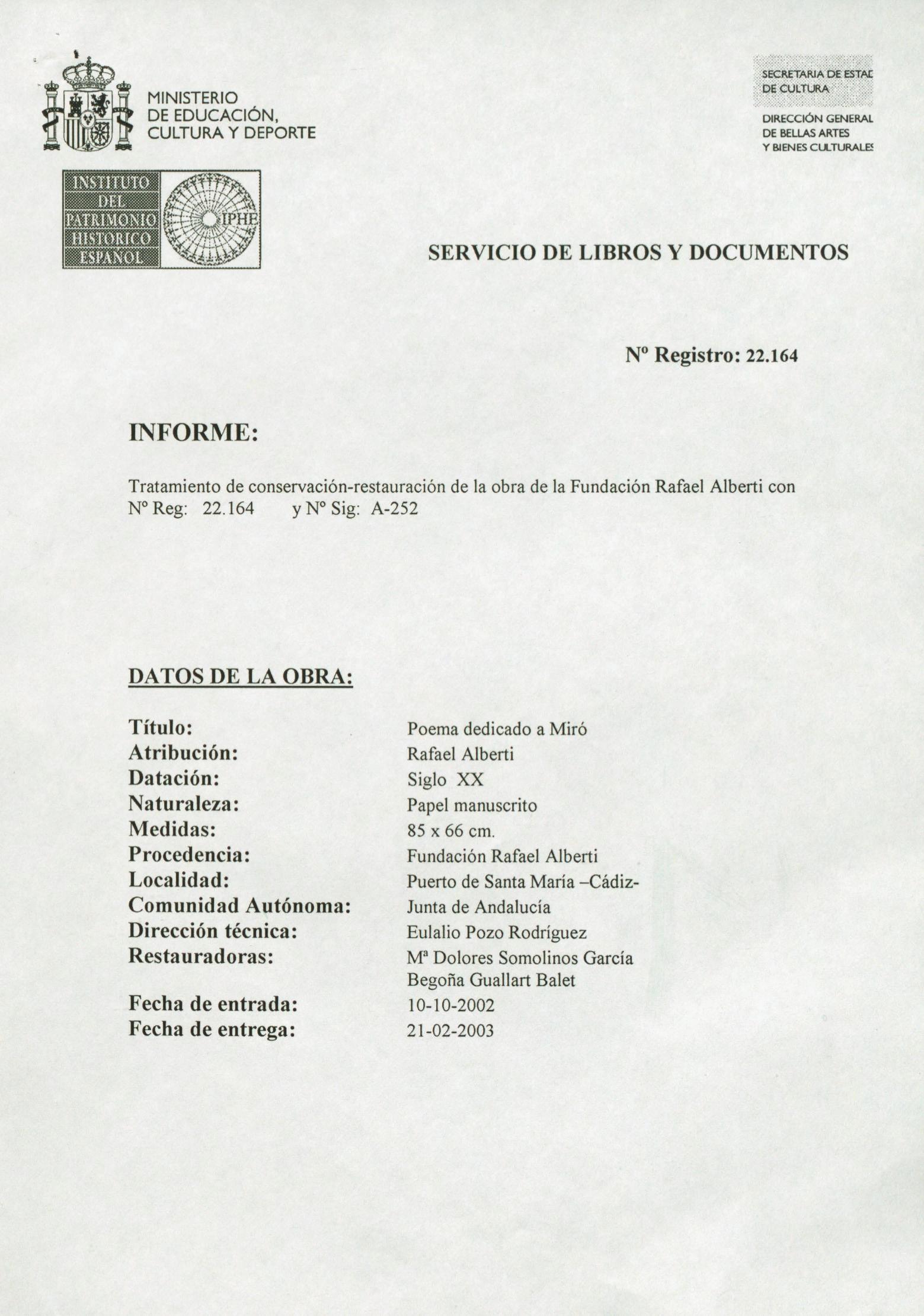 Restauración de un poema dedicado a Miró, de Rafael Alberti, procedente de la Fundación Rafael Alberti en El Puerto de Santa María (Cádiz)