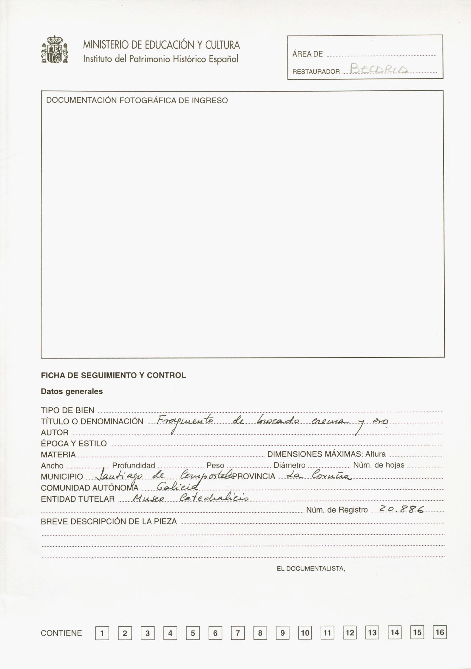 Restauración de cinco fragmentos de brocado de la urna relicario de Santa Susana, procedentes del Museo de la Catedral de Santiago de Compostela (A Coruña)