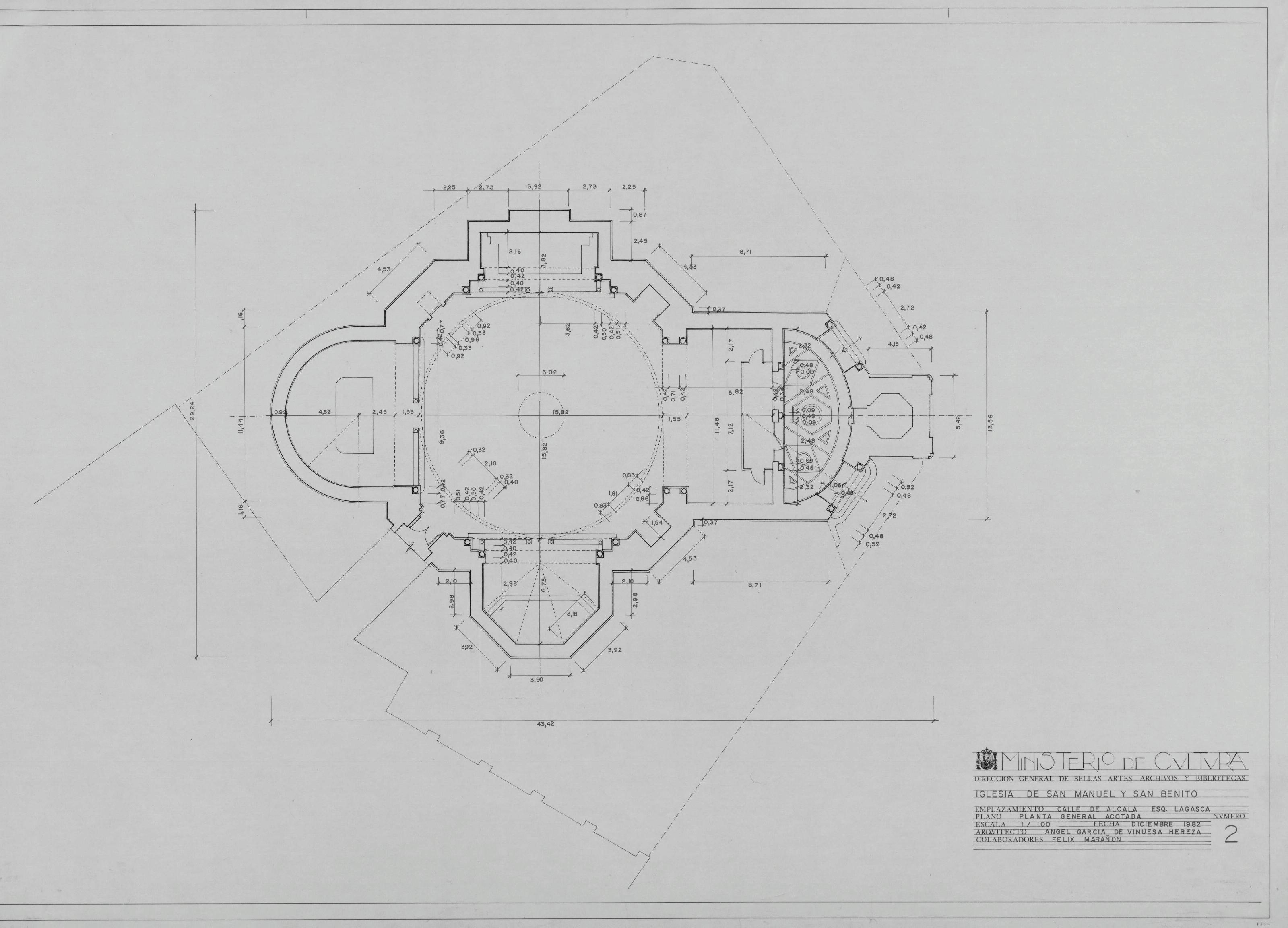IGLESIA DE SAN MANUEL Y SAN BENITO -MADRID-: PLANTA GENERAL, ACOTADA. Planta general de la Iglesia. Emplazamiento a calle de Alcala, esquina Lagasca. Plano sin cotas.