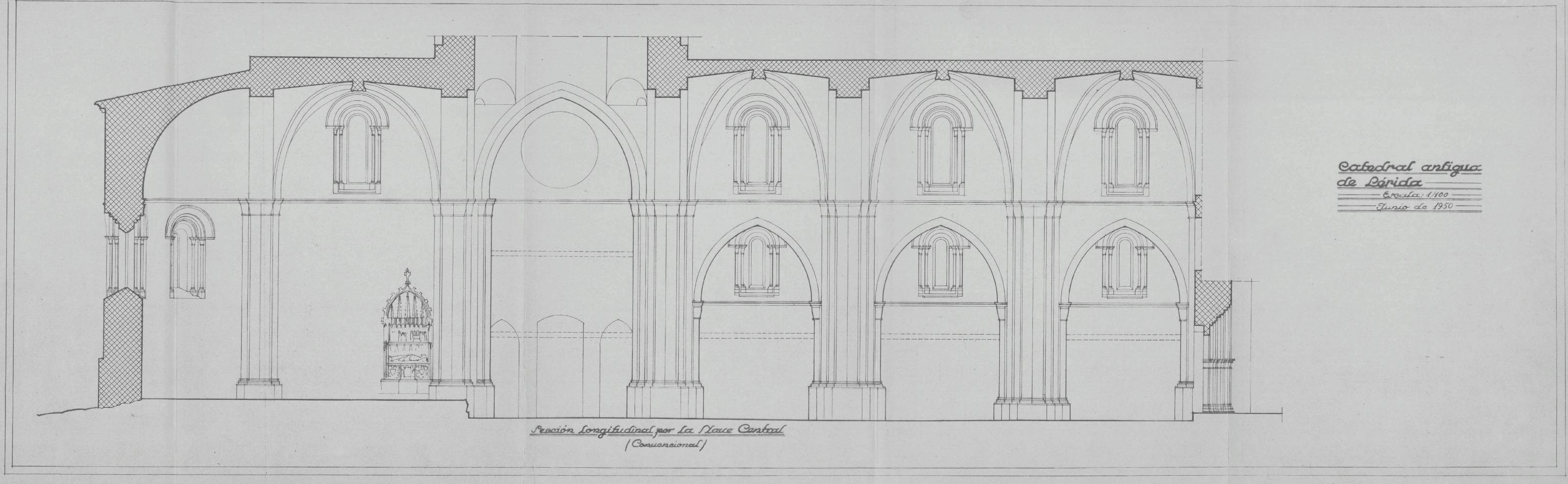 CATEDRAL ANTIGUA DE LLEIDA: SECCION LONGITUDINAL POR LA NAVE CENTRAL. (CONVENTUAL)