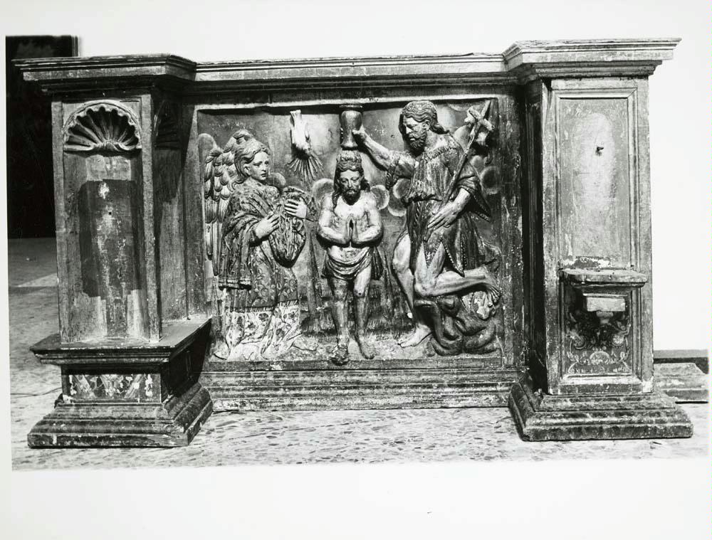 Fotografía del relieve "El bautismo de Cristo", procedente del retablo de la Iglesia parroquial de Vejorís de Toranzo, en Santiurde de Toranzo (Cantabria)