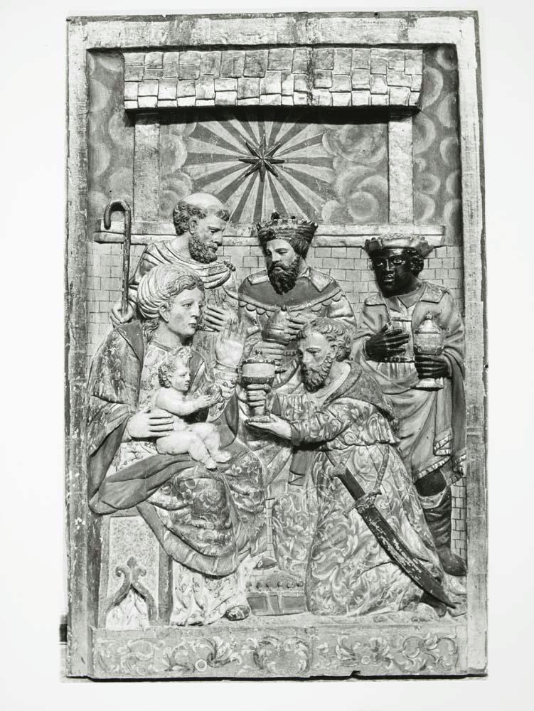 Fotografía del relieve "Adoración de los Reyes", procedente del retablo de la Iglesia parroquial de Vejorís de Toranzo, en Santiurde de Toranzo (Cantabria)