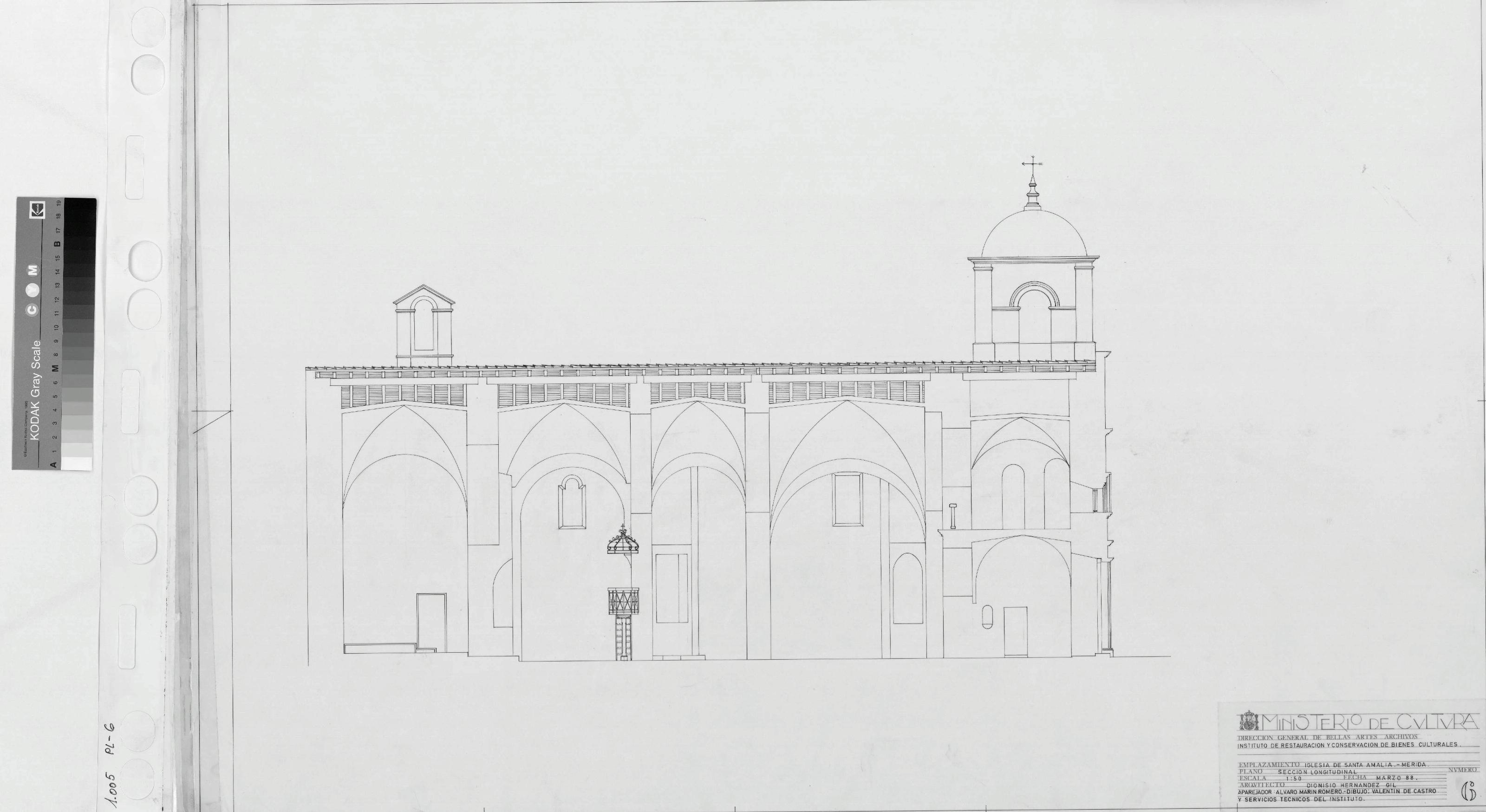 IGLESIA DE SANTA AMALIA MERIDA (Badajoz): SECCION LONGITUDINAL Dibujado de líneas principales y recercados así como el armado de cubierta y proyección de torre. Todo en línea fina. Sin firmar