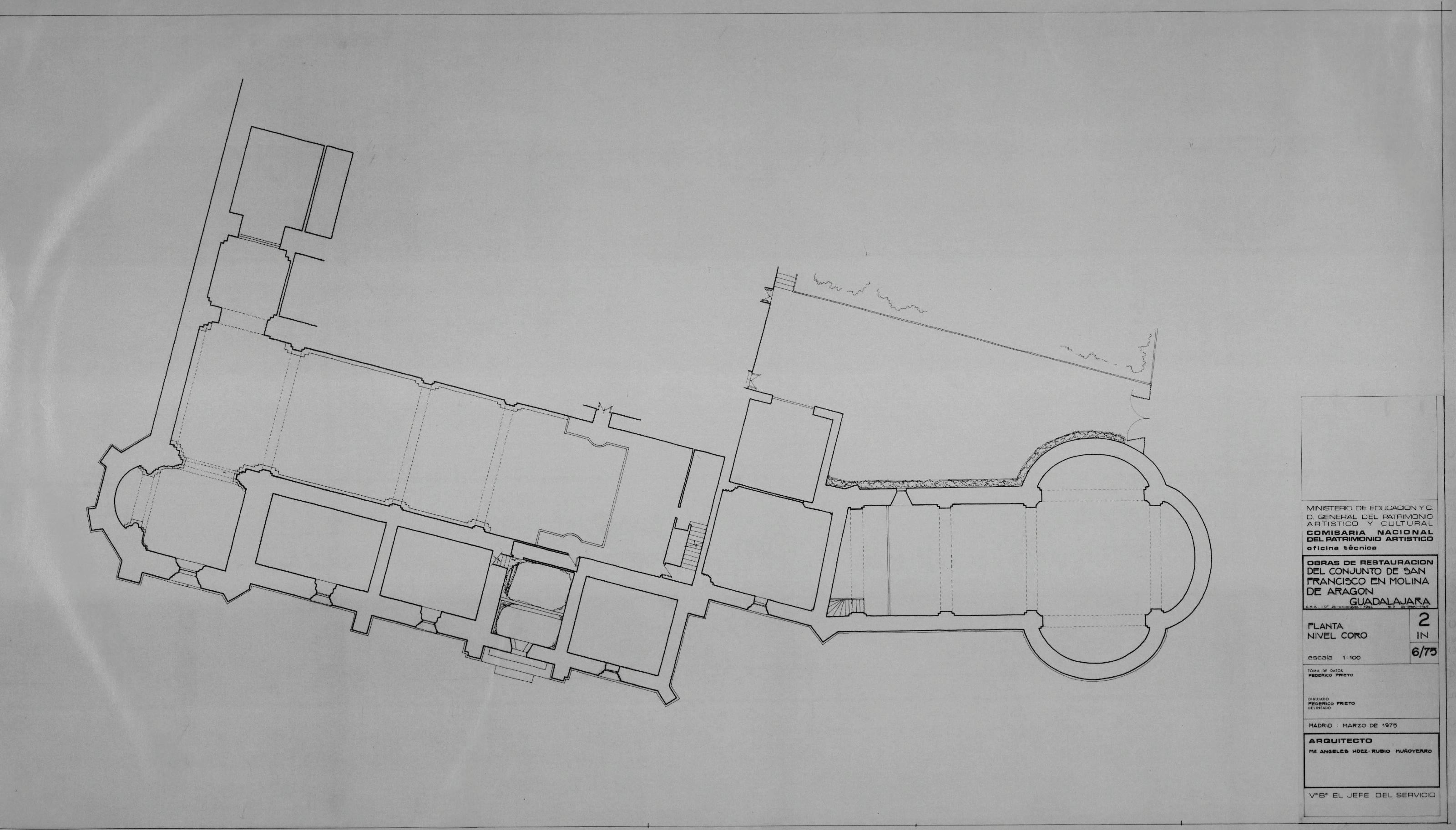 CONJUNTO DE SAN FRANCISCO EN MOLINA DE ARAGON - GUADALAJARA-: PLANTA NIVEL CORO ,plano con muros regruesados y sin mas documentacion, plano sin cotas.