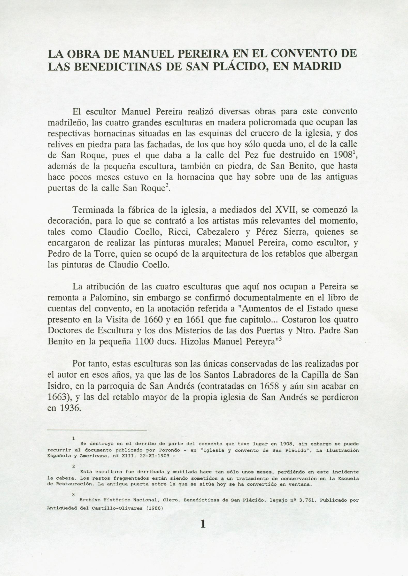 Restauración de cuatro esculturas de madera policromada, de Manuel Pereira, procedentes del Convento de las Benedictinas de San Plácido de Madrid