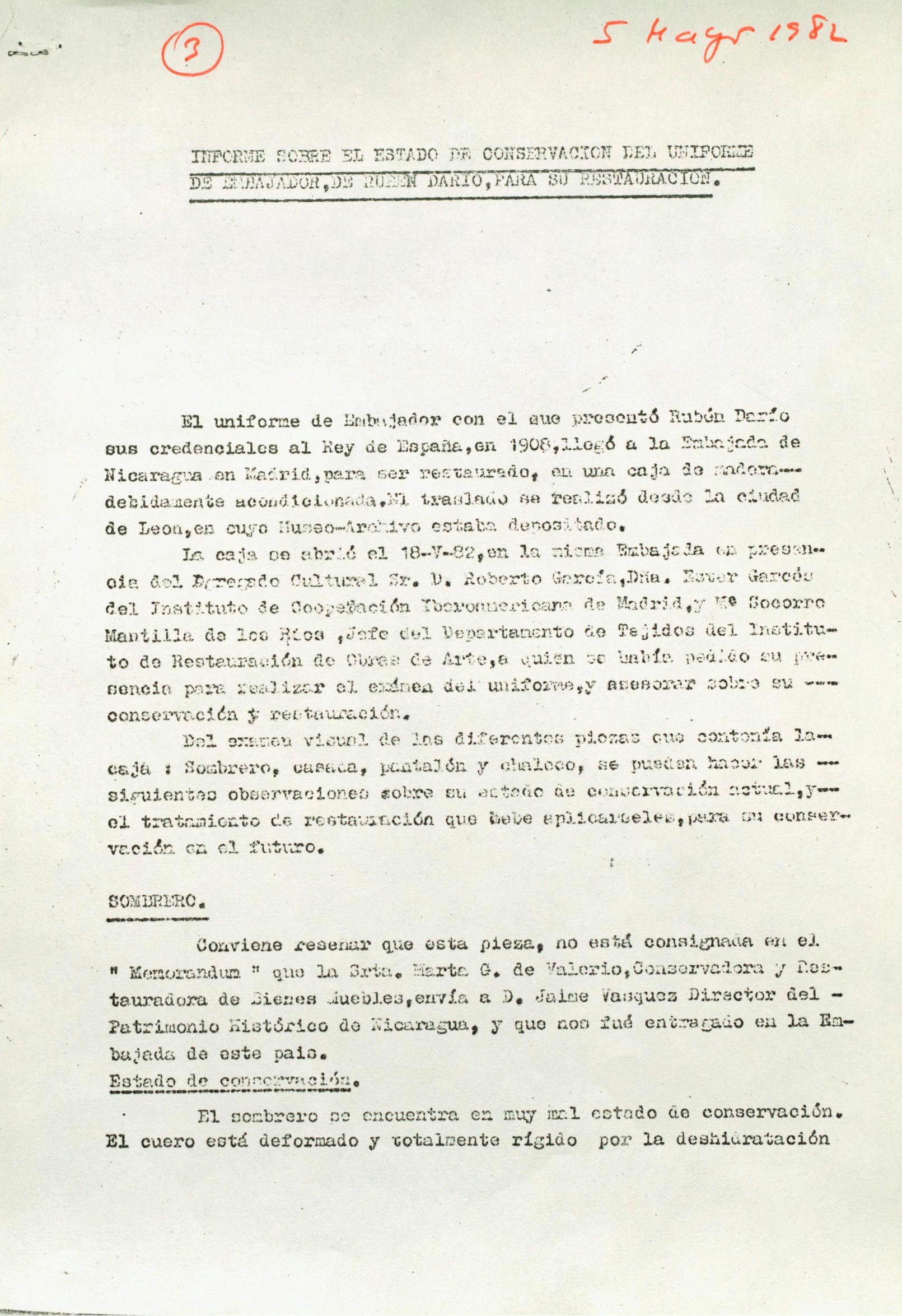 Informe de conservación del uniforme de diplomático del poeta Rubén Darío procedente de la Embajada de Nicaragua en Madrid