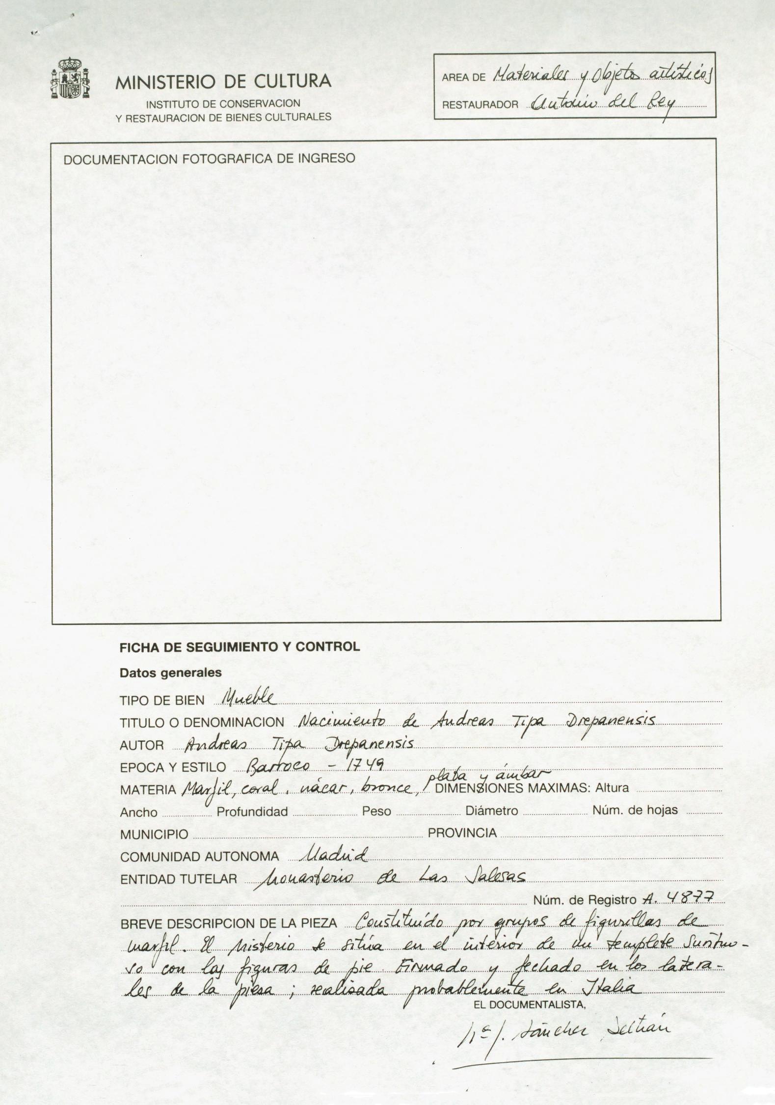 Informes de conservación de un Nacimiento de marfil, coral y nácar, de Andreas Tipa Drepanensis, procedente del Convento de las Salesas Reales de Madrid