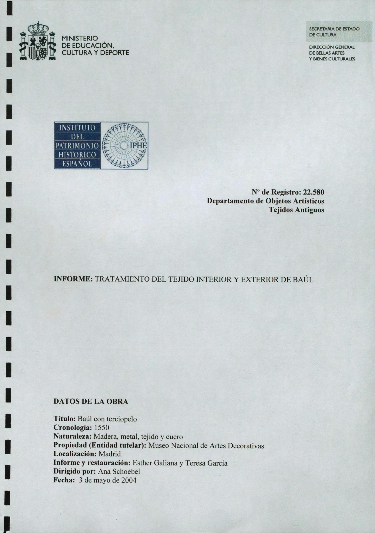 Restauración para la desinsectación de tejidos de un baúl de madera, procedente del Museo Nacional de Artes Decorativas (Madrid)