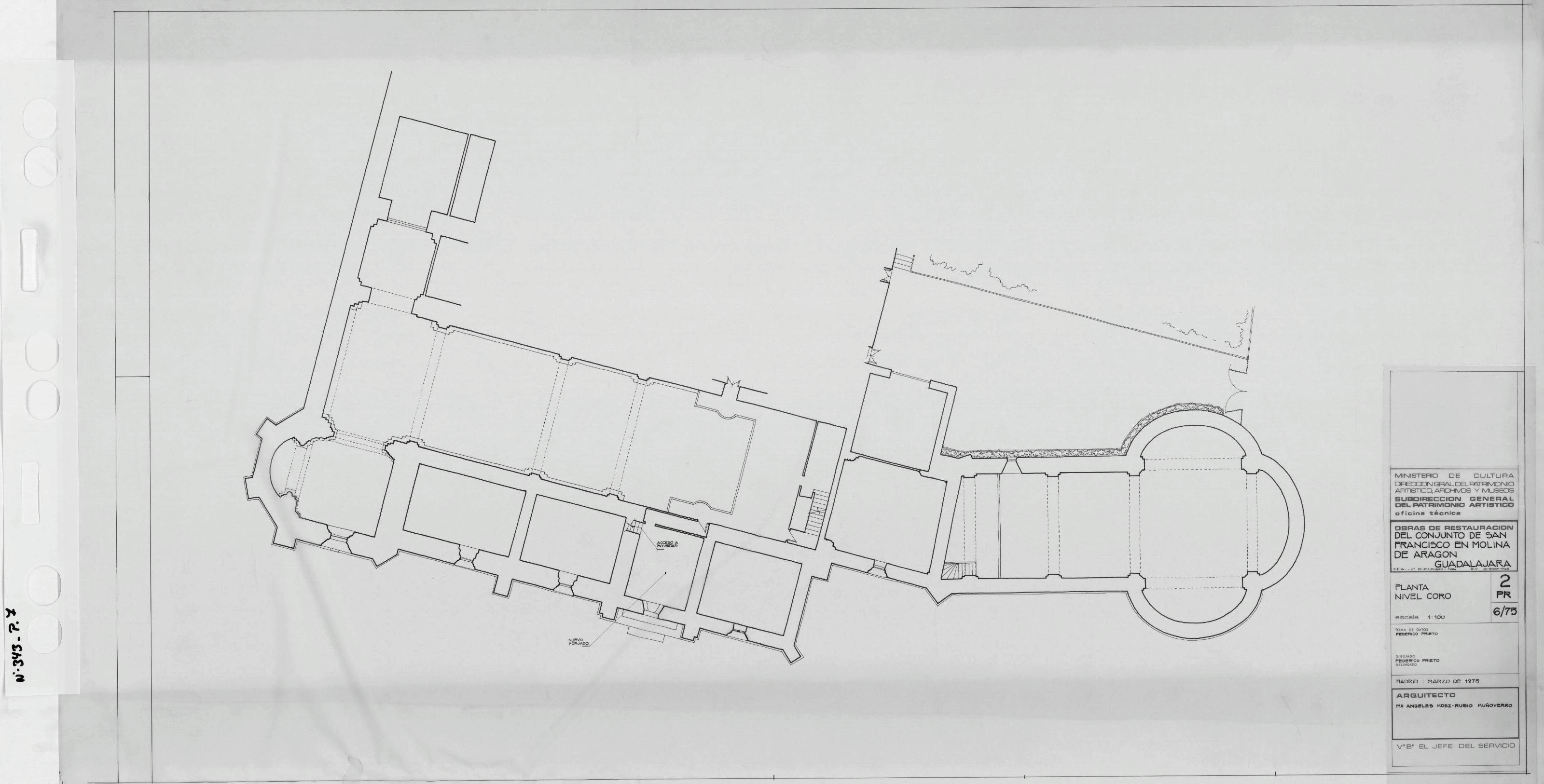 CONJUNTO DE SAN FRANCISCO EN MOLINA DE ARAGON - GUADALAJARA-: PLANTA NIVEL CORO. Plano con muros reguesados, en este plano nos marca una zona donde se va a reponer un nuevo forjado, tambien biene señalado el acceso a las bovedas. Plano sin cotas