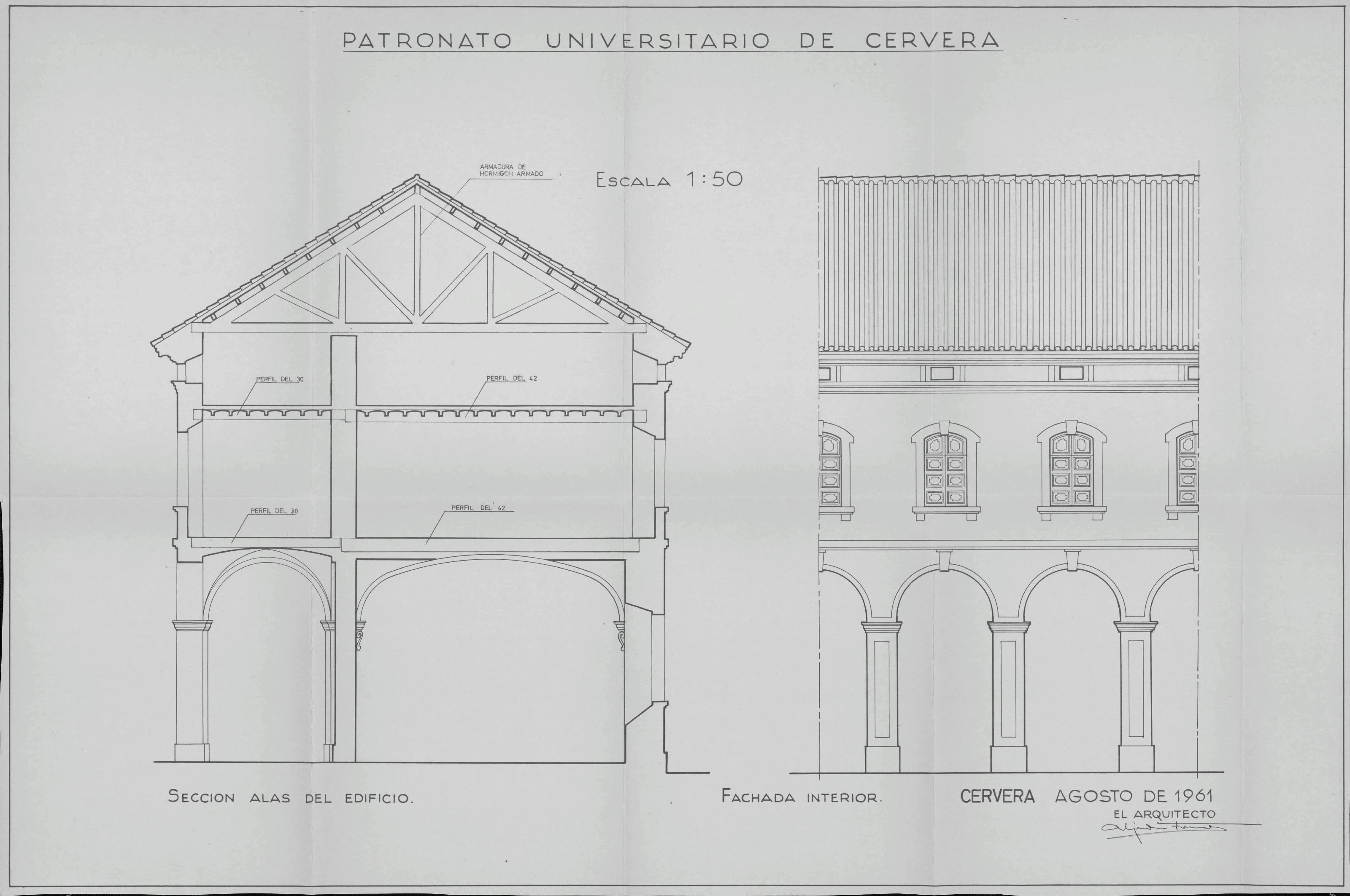 RECONSTRUCCION DE LA UNIVERSIDAD DE CERVERA: SECCION ALAS DEL EDIFICIO Y FACHADA INTERIOR