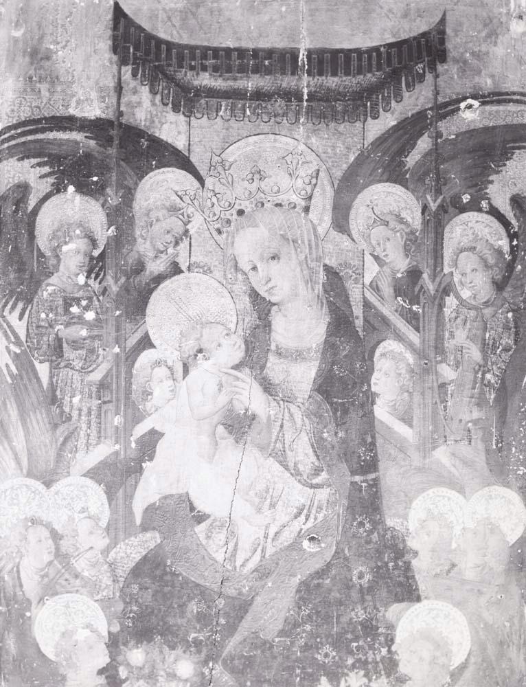 Fotografía de la tabla "Virgen entronizada con niño y ángeles", del retablo de la Ermita del Espíritu Santo en Santa Cruz de Moya (Cuenca)