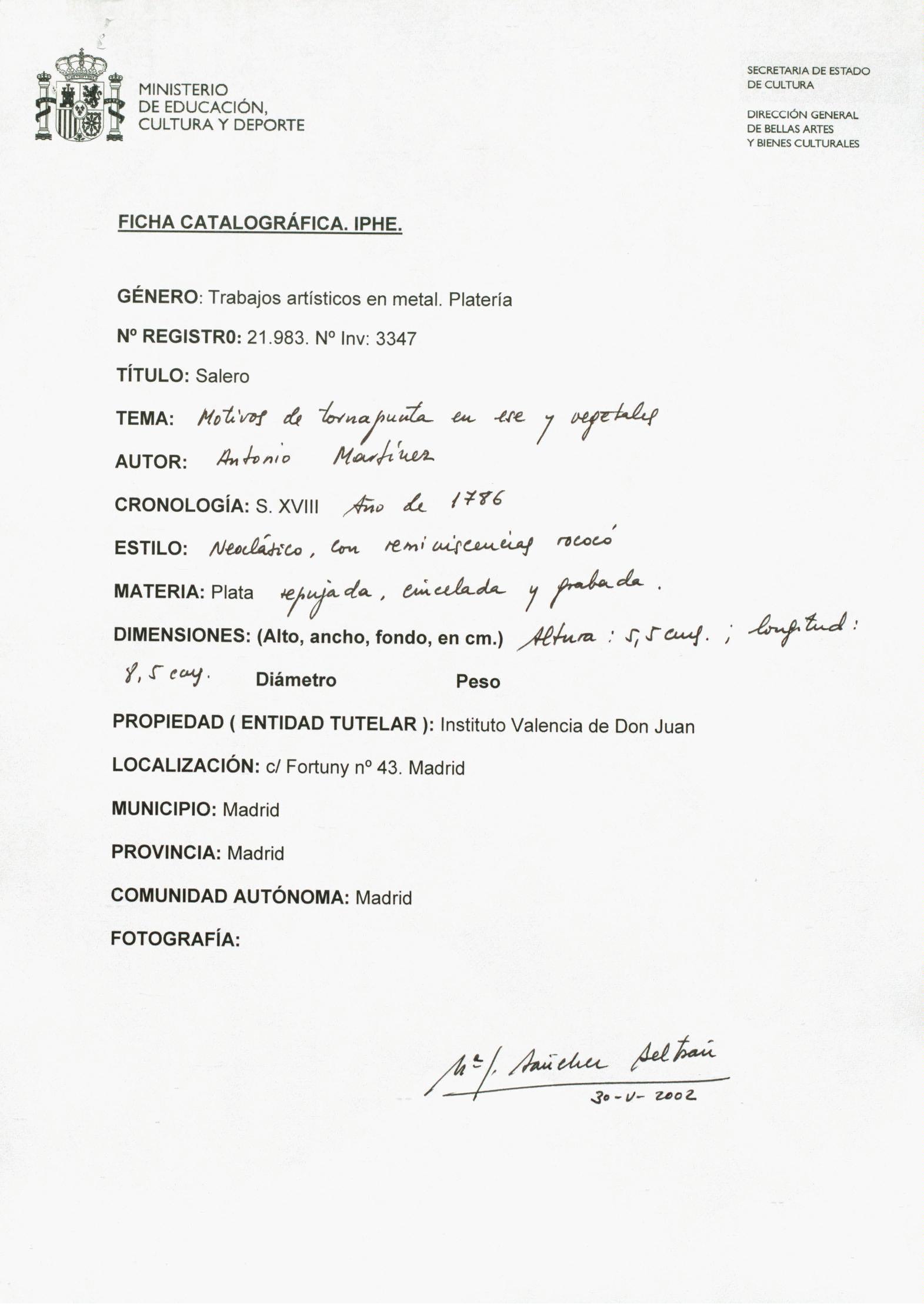 Restauración de un salero neoclásico de plata procedente del Instituto Valencia de Don Juan de Madrid