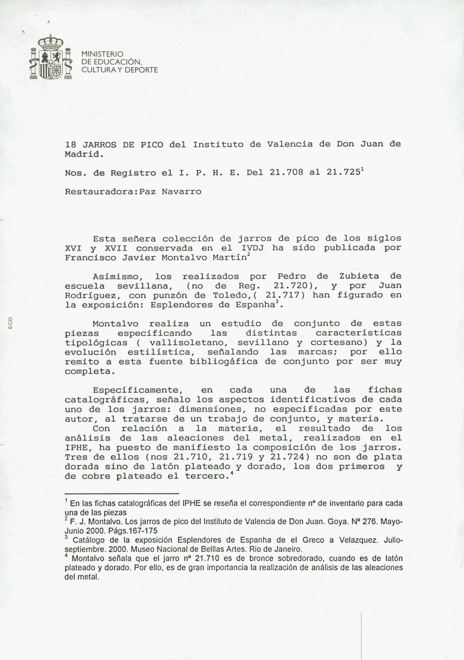 Restauración de dieciocho jarros de pico de plata, de los siglos XVI y XVII, procedentes del Instituto Valencia de Don Juan de Madrid