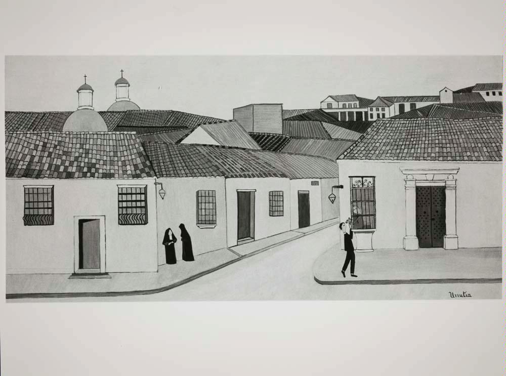 Fotografía de la restauración del lienzo "Una calle de Popayán", de Sofía de Urrutia, procedente del Instituto de Cooperación Iberoamericana (Madrid)