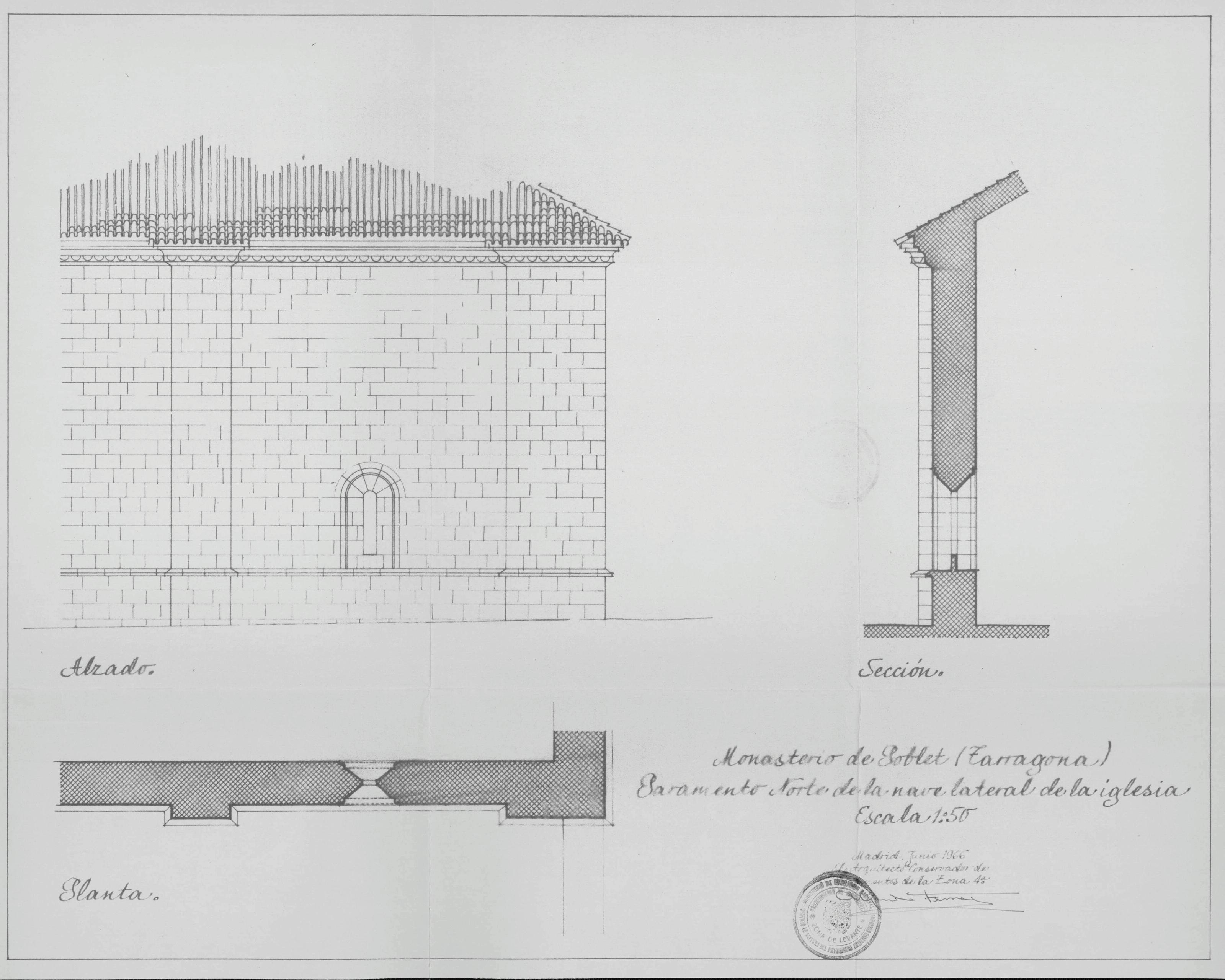 PALACIO DEL REY MARTIN EN EL MONASTERIO DE SANTA MARIA: PARAMENTO NORTE DE LA NAVE LATERAL DE LA IGLESIA (ALZADO PLANTA Y SECCION)