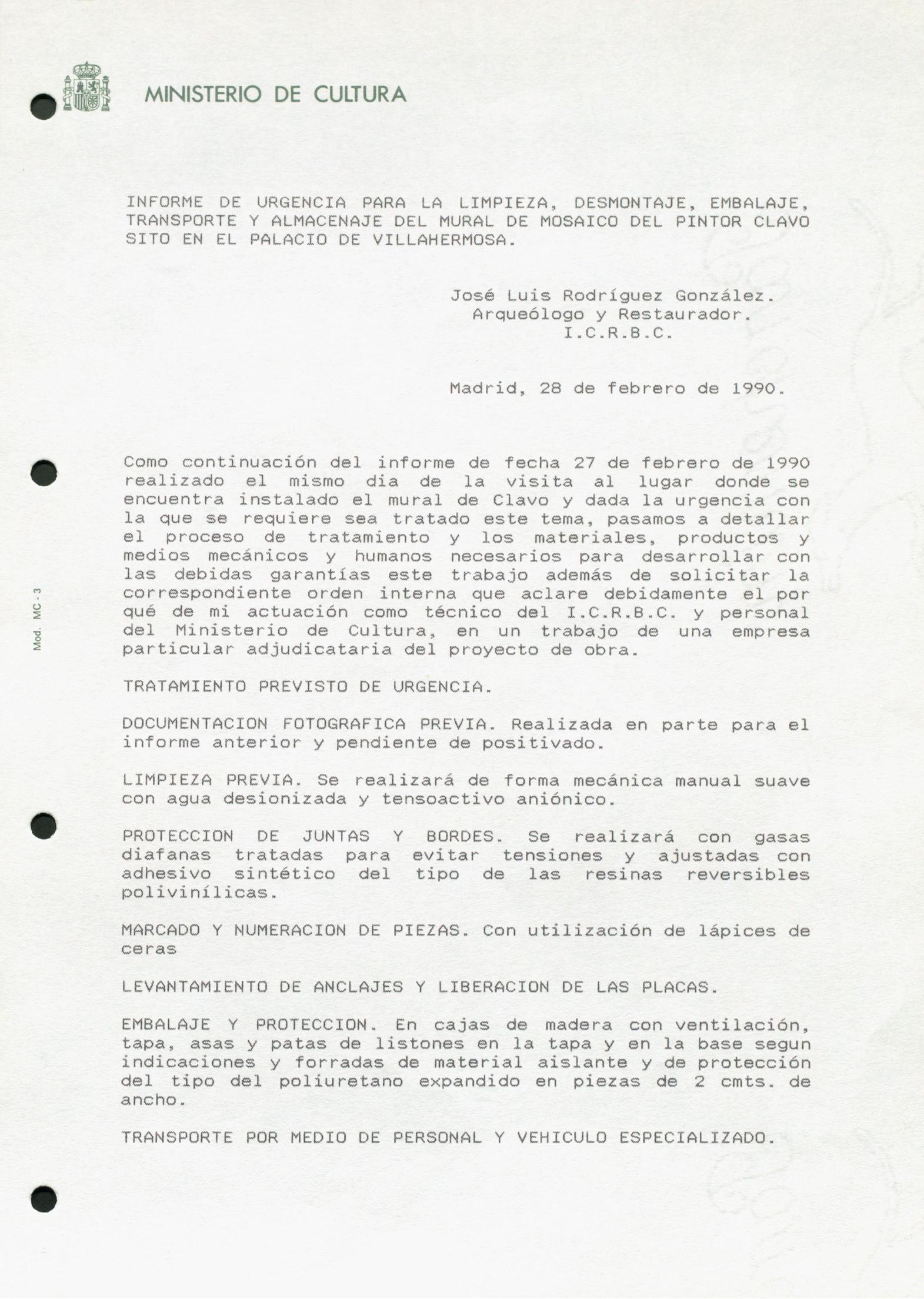 Informe para la limpieza, desmontaje, embalaje, transporte y almacenaje del mosaico del pintor Clavo, procedente del Palacio de Villahermosa (Madrid)