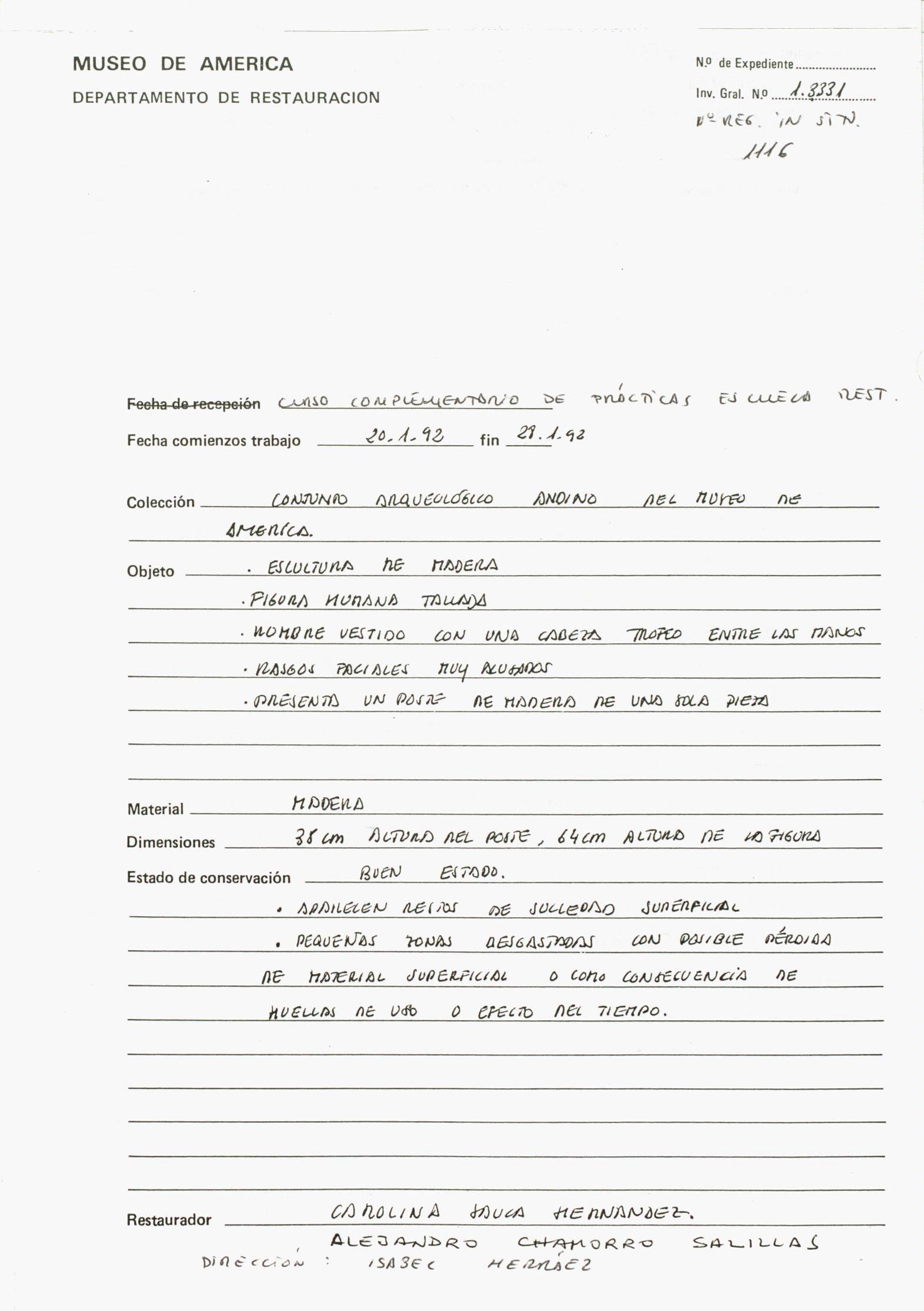 Restauración in situ de armas, esculturas en madera, máscaras y objetos de etnografía precolombinas, procedentes del Museo de América (Madrid)