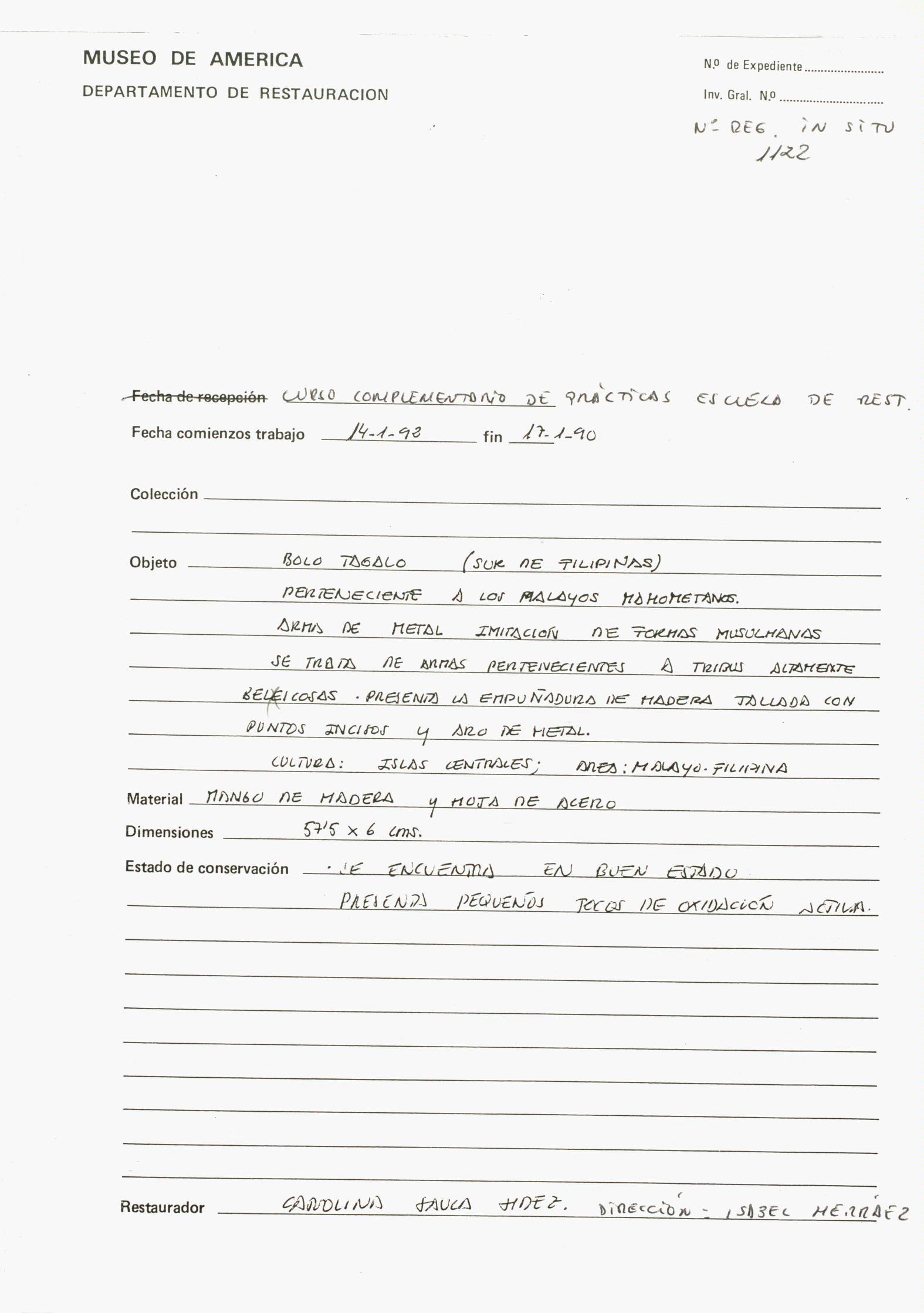 Restauración de un bolo tagalo de los malayos mahometanos de Filipinas, perteneciente al Museo de América (Madrid)