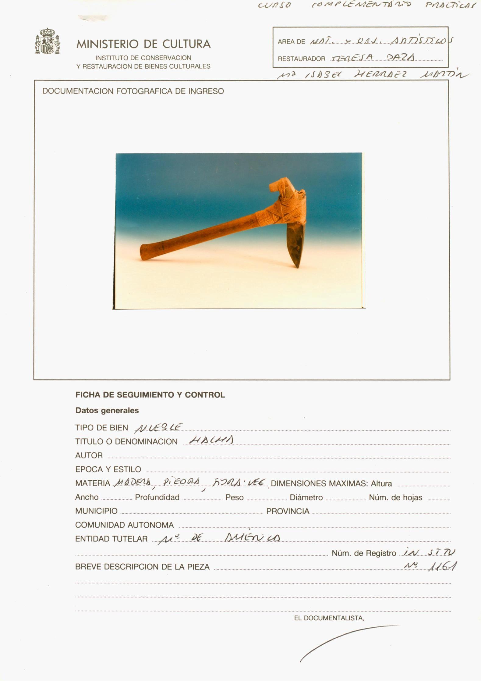 Restauración de una hacha de piedra unida a mango de madera de la isla de Tahití, perteneciente al Museo de América (Madrid)
