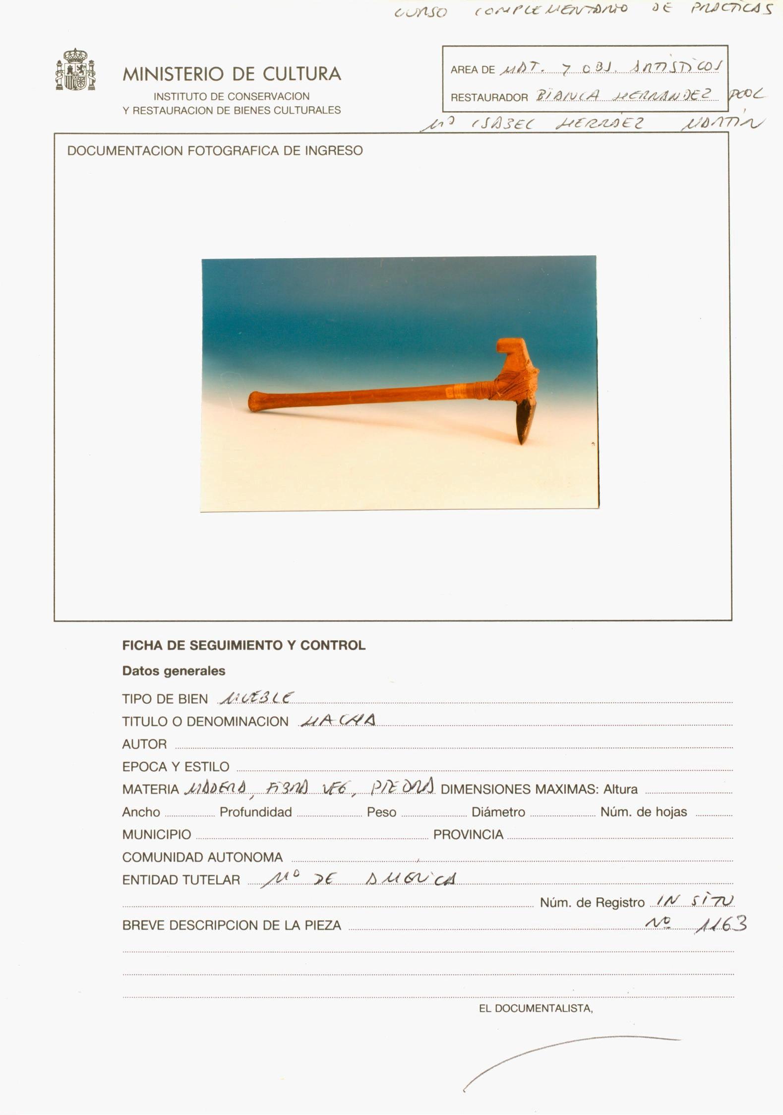 Restauración de una hacha de piedra unida a mango de madera de la isla de Tahití, perteneciente al Museo de América (Madrid)