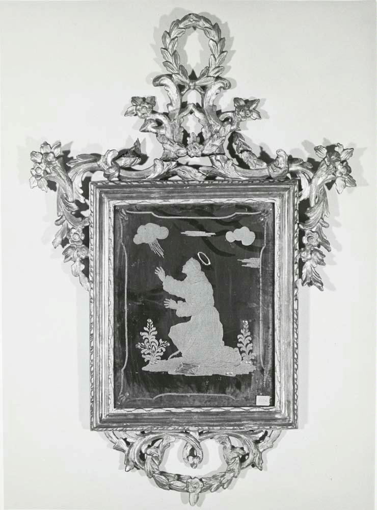 Fotografía de una cornucopia de madera tallada y dorada, formada por un espejo de forma rectangular con la figura de San Antonio de Padua esmerilada, procedente del Museo Cerralbo (Madrid)