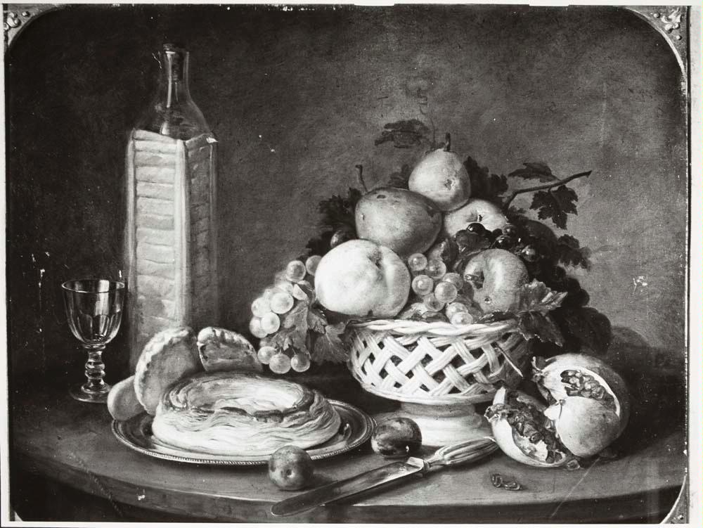 Bodegón con fuente de frutas, pastel de hojaldre y vino / José María Estrada. Museo Cerralbo (Madrid)