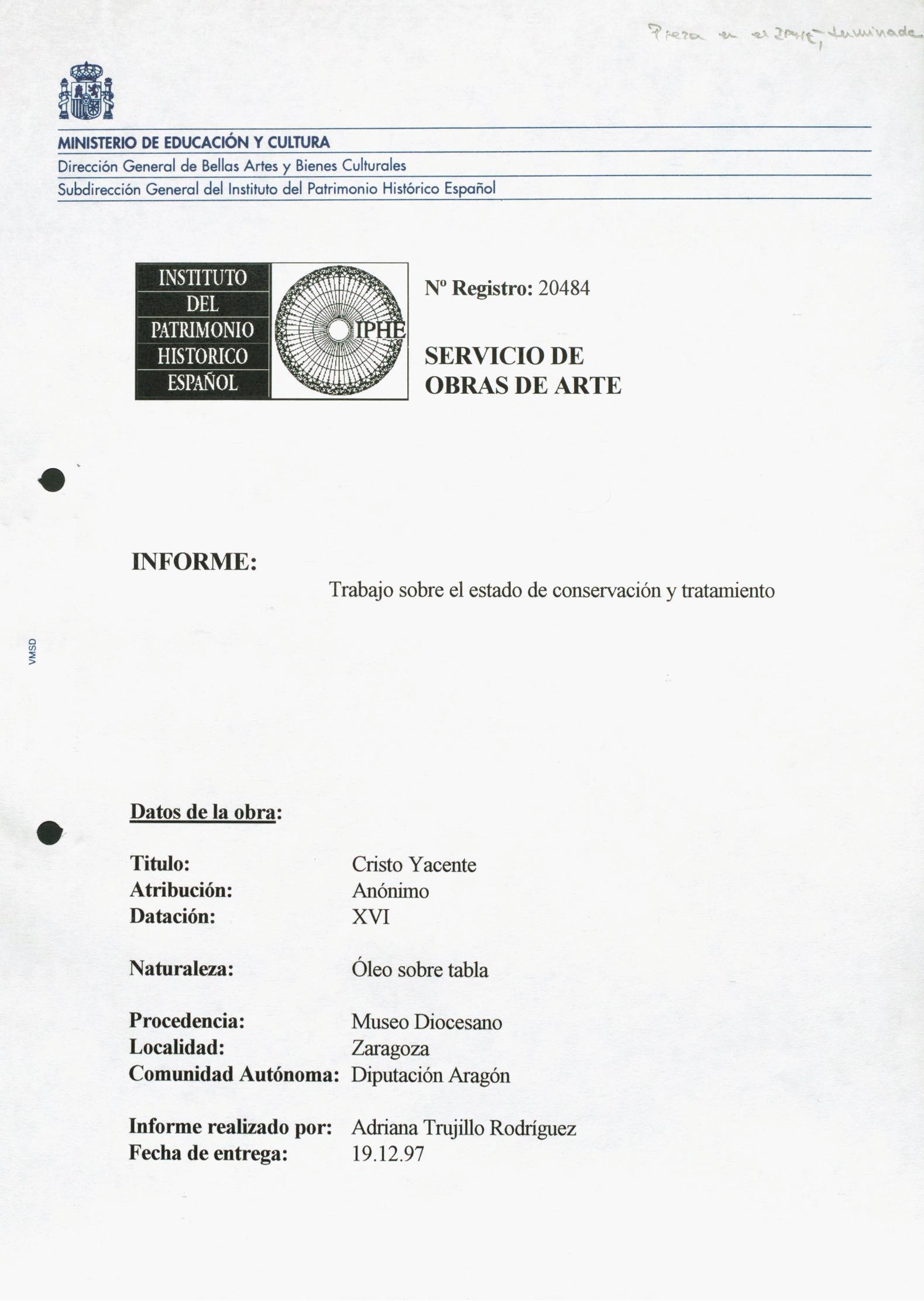 Restauración de la pintura sobre tabla "Cristo yacente" propiedad del Arzobispado de Zaragoza, procedente del Museo Diocesano de Zaragoza