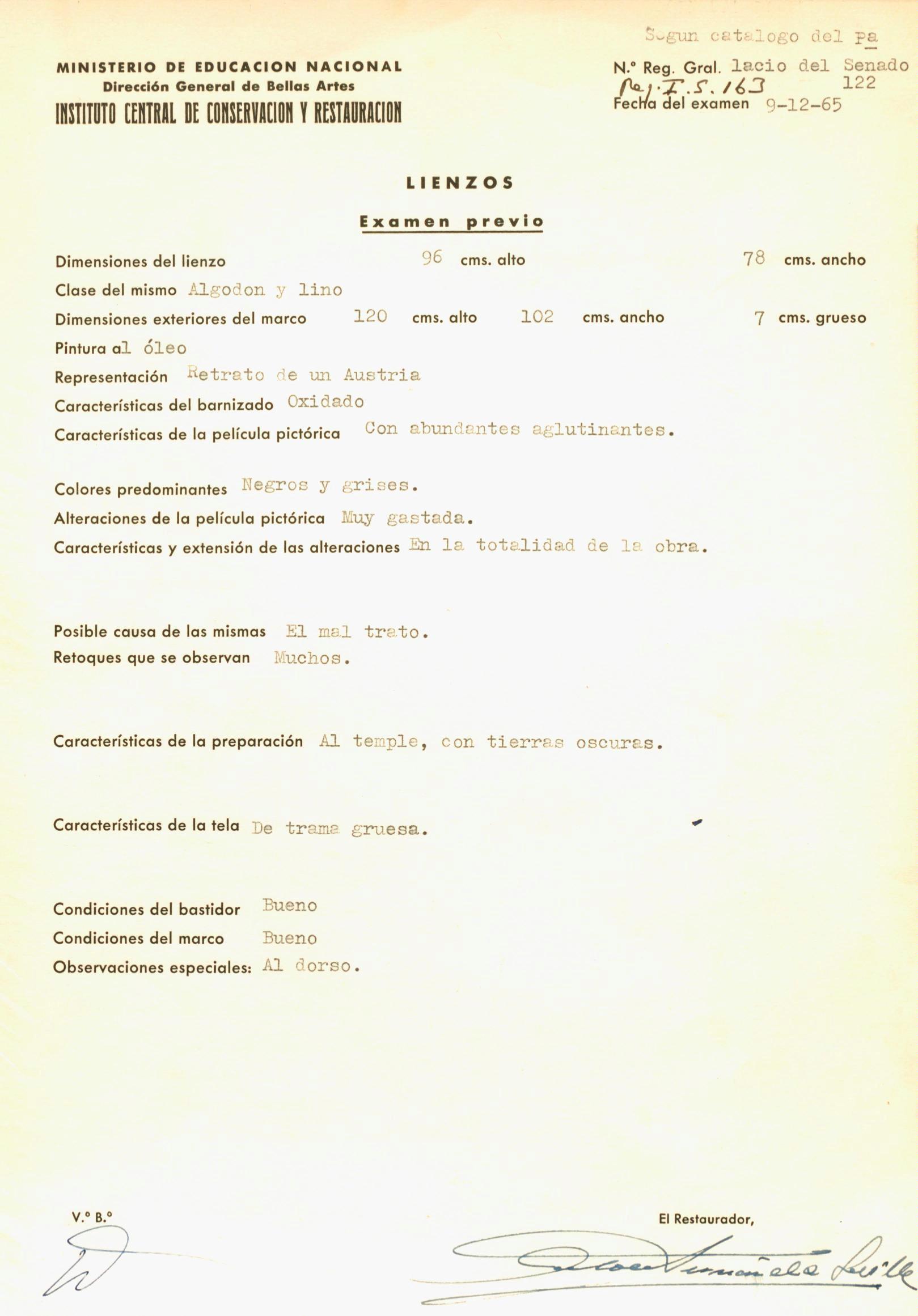 Restauración de los lienzos "Revista Naval" y "Retrato de un Austria" procedentes del Palacio del Senado, encargadas por el Consejo General del Movimiento (Madrid)