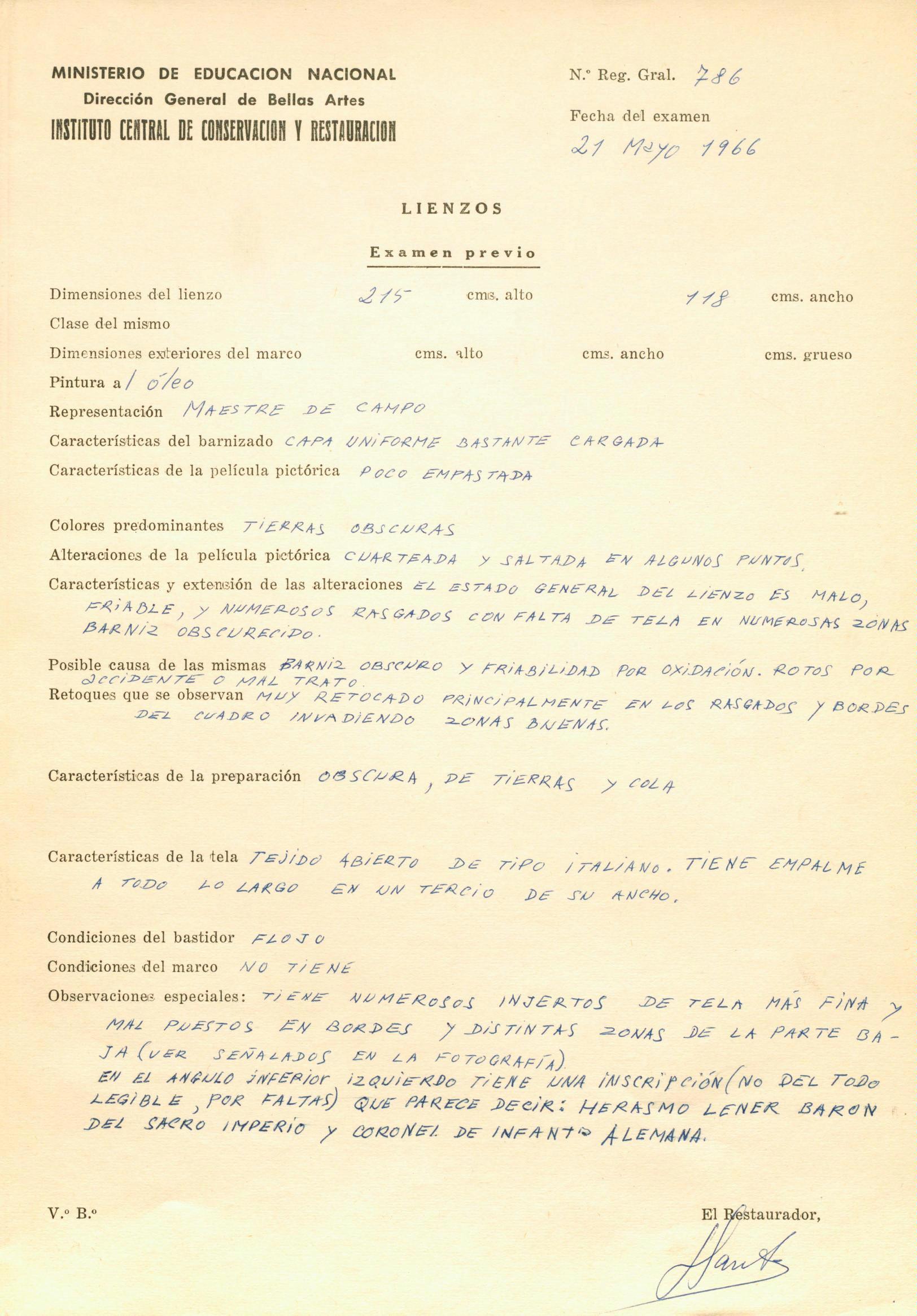 Restauración del lienzo "Maestre de Campo" procedente del Palacio del Senado, encargada por el Consejo General del Movimiento (Madrid)