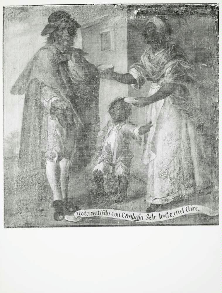 Fotografía de la restauración del lienzo "Note entiendo con Cambuja sale Tente en el aire", de Luis Berrueco, procedente de la colección de Bartolomé March (Madrid)