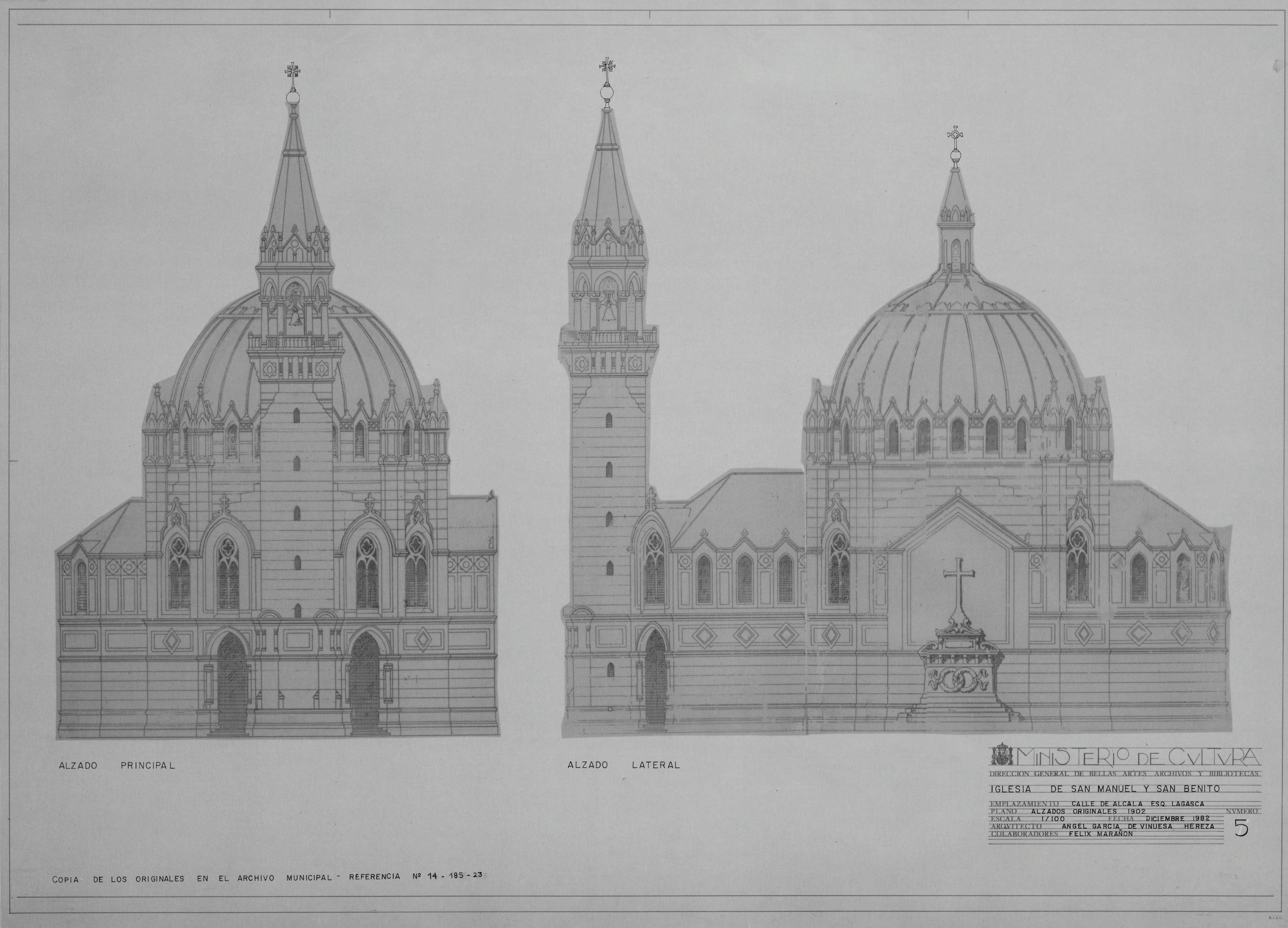 IGLESIA DE SAN MANUEL Y SAN BENITO -MADRID-: ALZADOS ORIGINALES DE 1902. Plano dibujado con detalle, son copias de los originales en el archivo municipal. Referencia: 14-185-23. Emplazamiento a calle de Alcala, esquina Lagasca. Plano sin cotas.