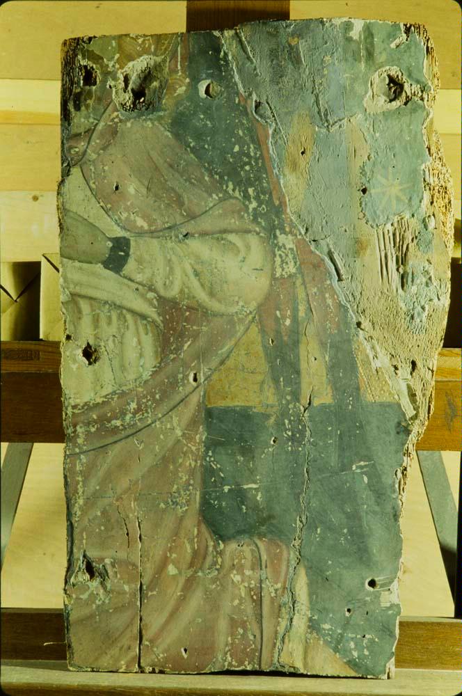 Fotografía de un fragmento de tabla con ángel, perteneciente al retablo mayor de la Iglesia parroquial de Santa Columba de Villamediana (Palencia)
