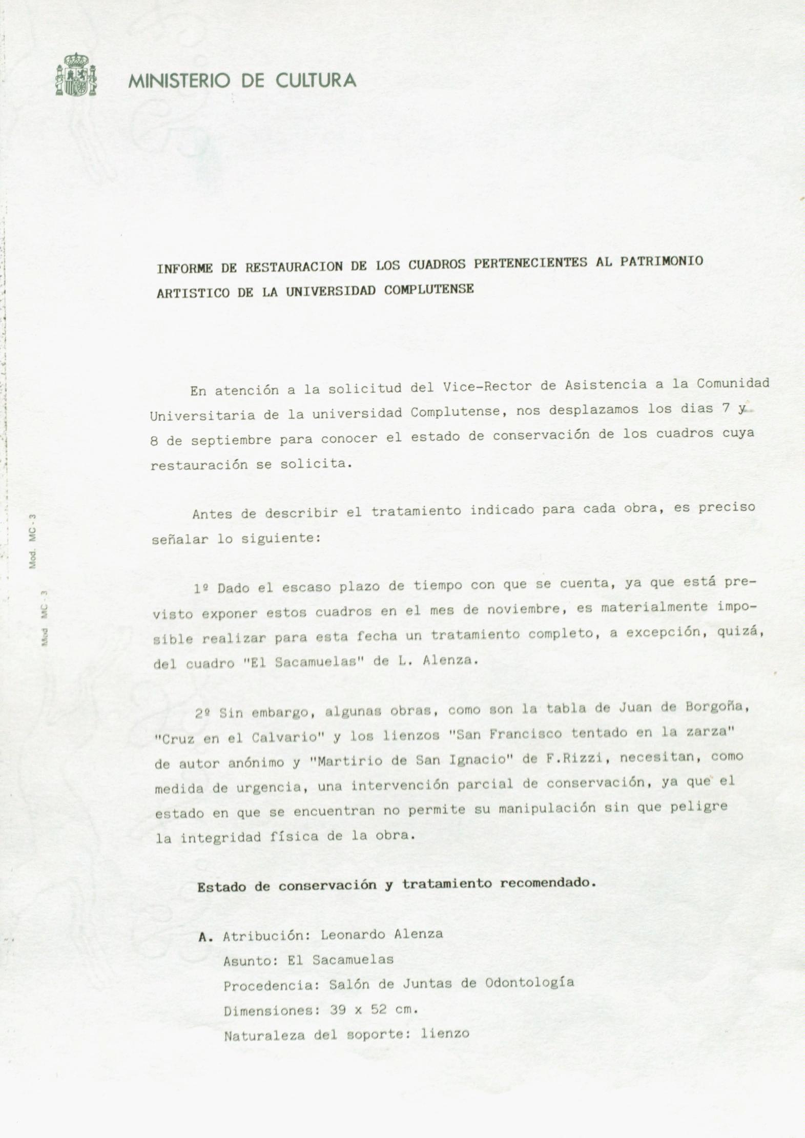 Informe de visita para la restauración de cinco cuadros, procedentes de la Universidad Complutense de Madrid