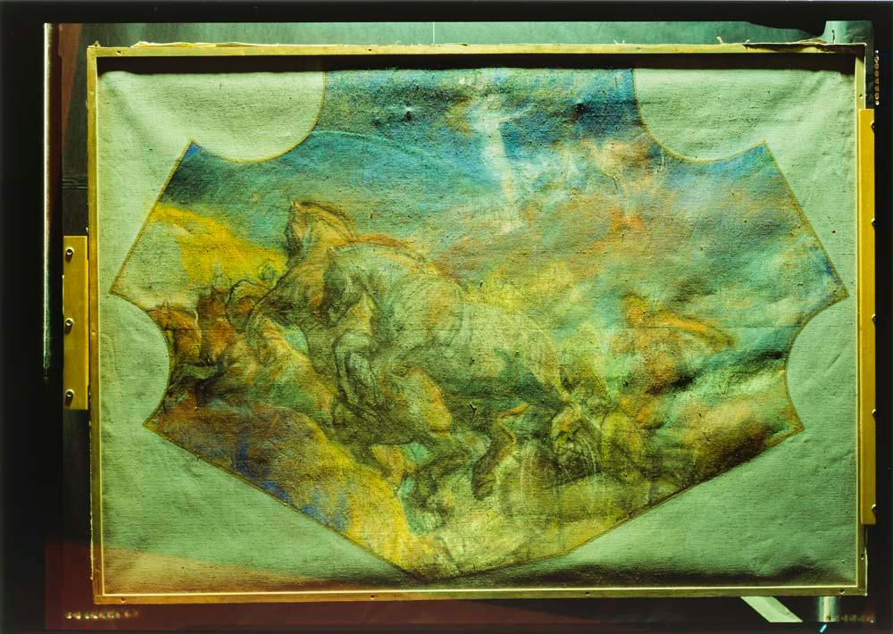 Fotografías de la restauración del cartón "Apolo conduciendo el carro del sol" pintado en tiza, de Joaquín Sorolla, procedente de la Universidad Complutense (Madrid)
