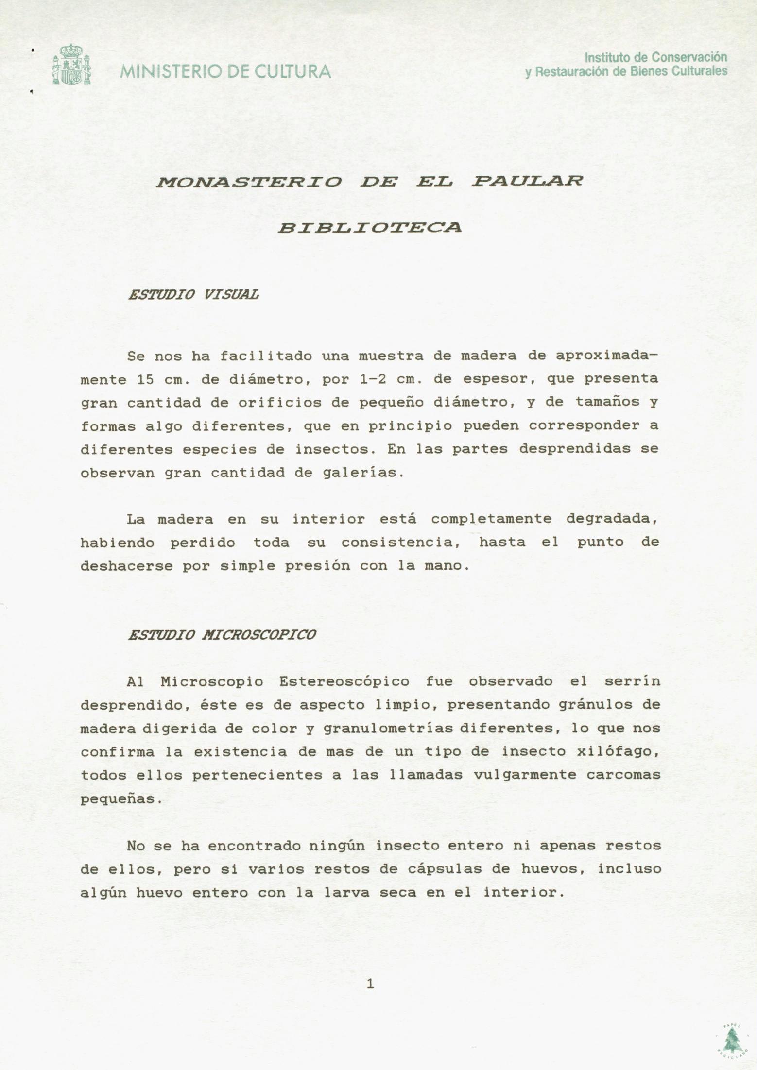 Informe de laboratorio sobre el análisis de la madera presente en la Biblioteca del Monasterio de Santa María de El Paular, en Rascafría (Madrid)