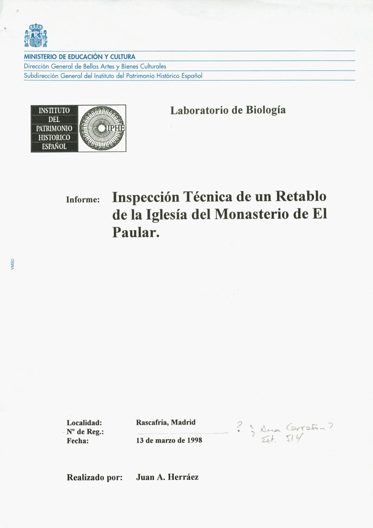 Informes de laboratorio y conservación de distintos elementos del Monasterio de Santa María del Paular en Rascafría (Madrid)