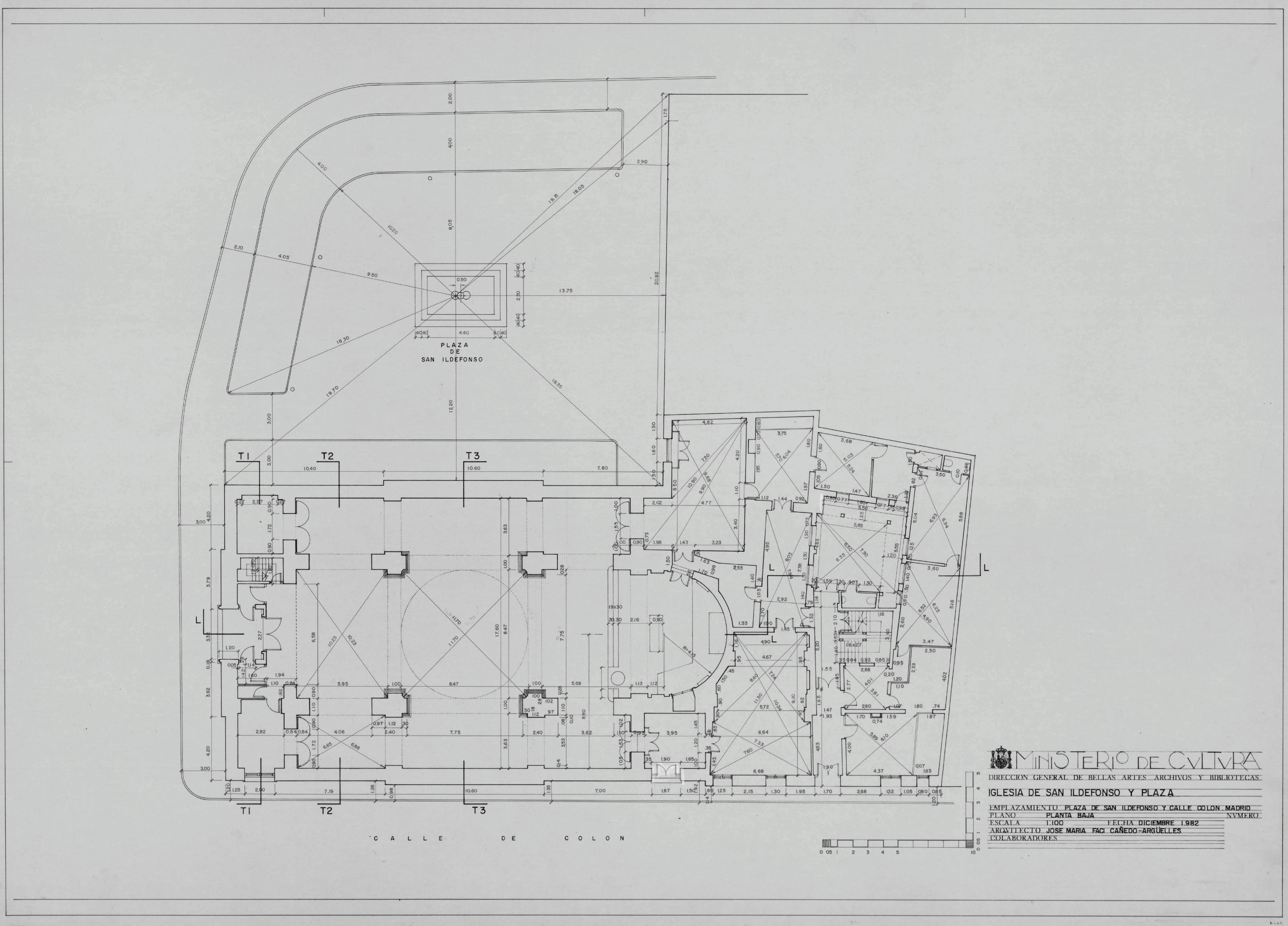 IGLESIA DE SAN ILDEFONSO Y PLAZA.: PLANTA BAJA, ACOTADA. Planta general de la Iglesia plaza con emplazamiento a plaza de San Ildefonso y calle Colón. Plano sin cotas.