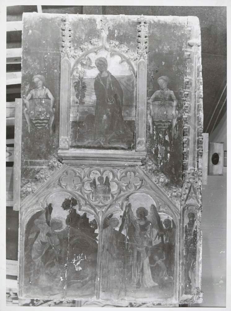 Restauración de tablas con dos escenas de la vida del Arcángel San Miguel, la Virgen en oración, dos personajes y un evangelista o profeta enmarcado bajo un pináculo, atribuidas al Maestro de Puxmarín, procedentes del retablo de San Miguel de la Catedral de Murcia