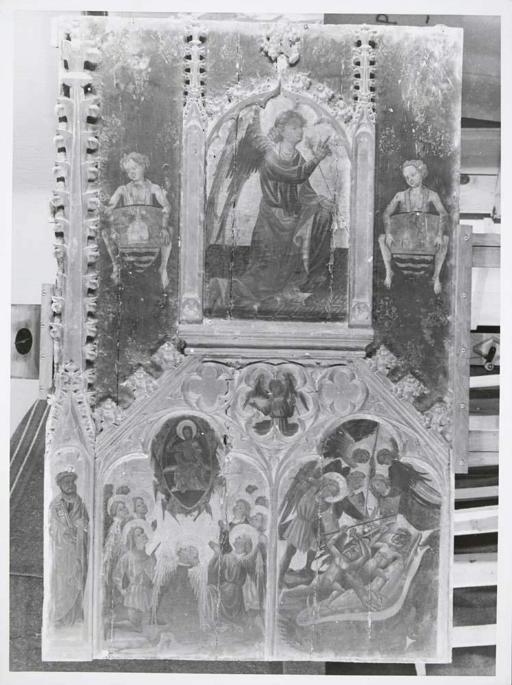 Restauración de tablas con tres escenas, dos personajes y un evangelista o profeta enmarcado bajo un pináculo, atribuidas al Maestro de Puxmarín, procedentes del retablo de San Miguel de la Catedral de Murcia