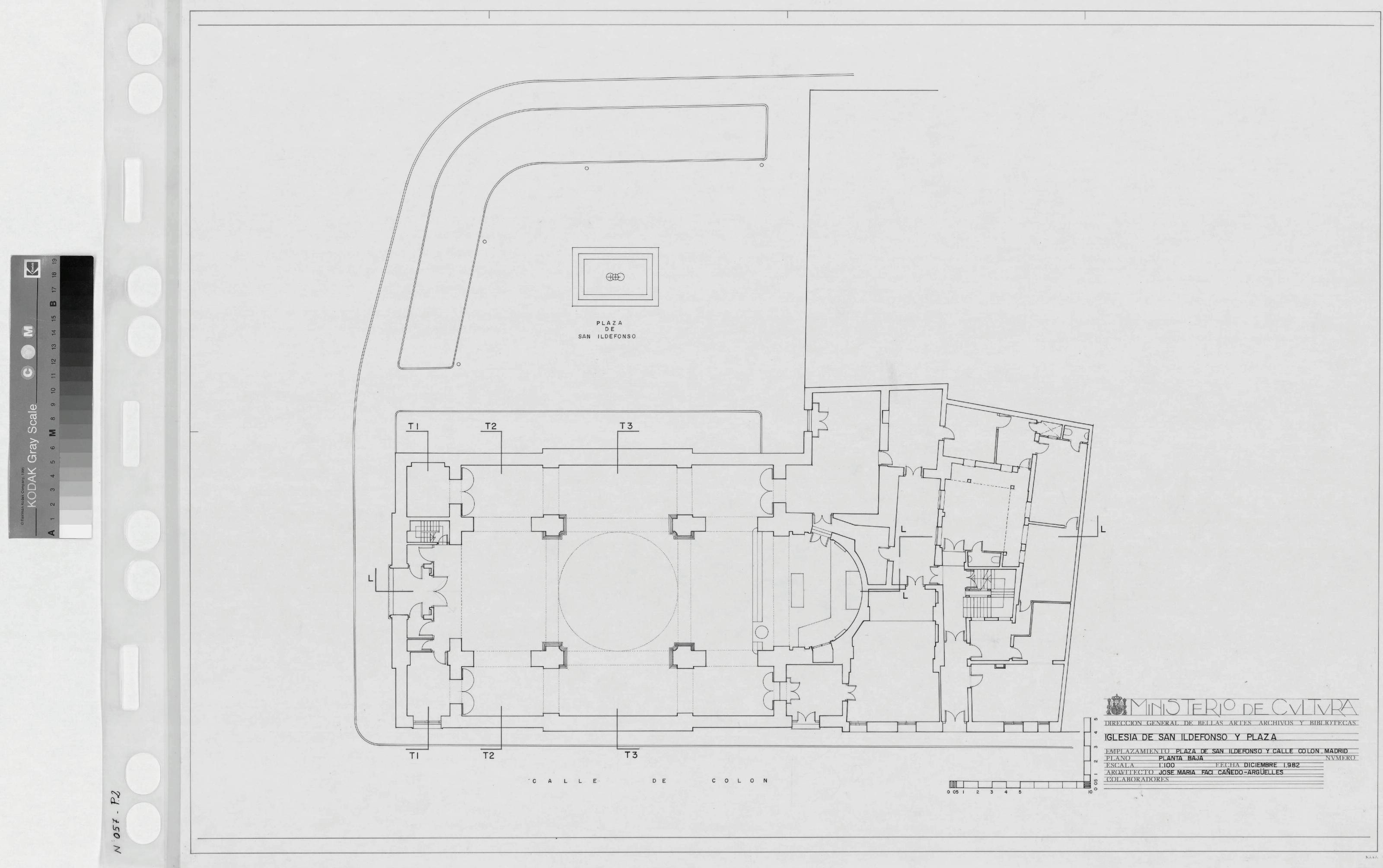 IGLESIA DE SAN ILDEFONSO Y PLAZA.: PLANTA BAJA. Planta general de la Iglesia plaza con emplazamiento a plaza de San Ildefonso y calle Colón. Plano sin cotas.