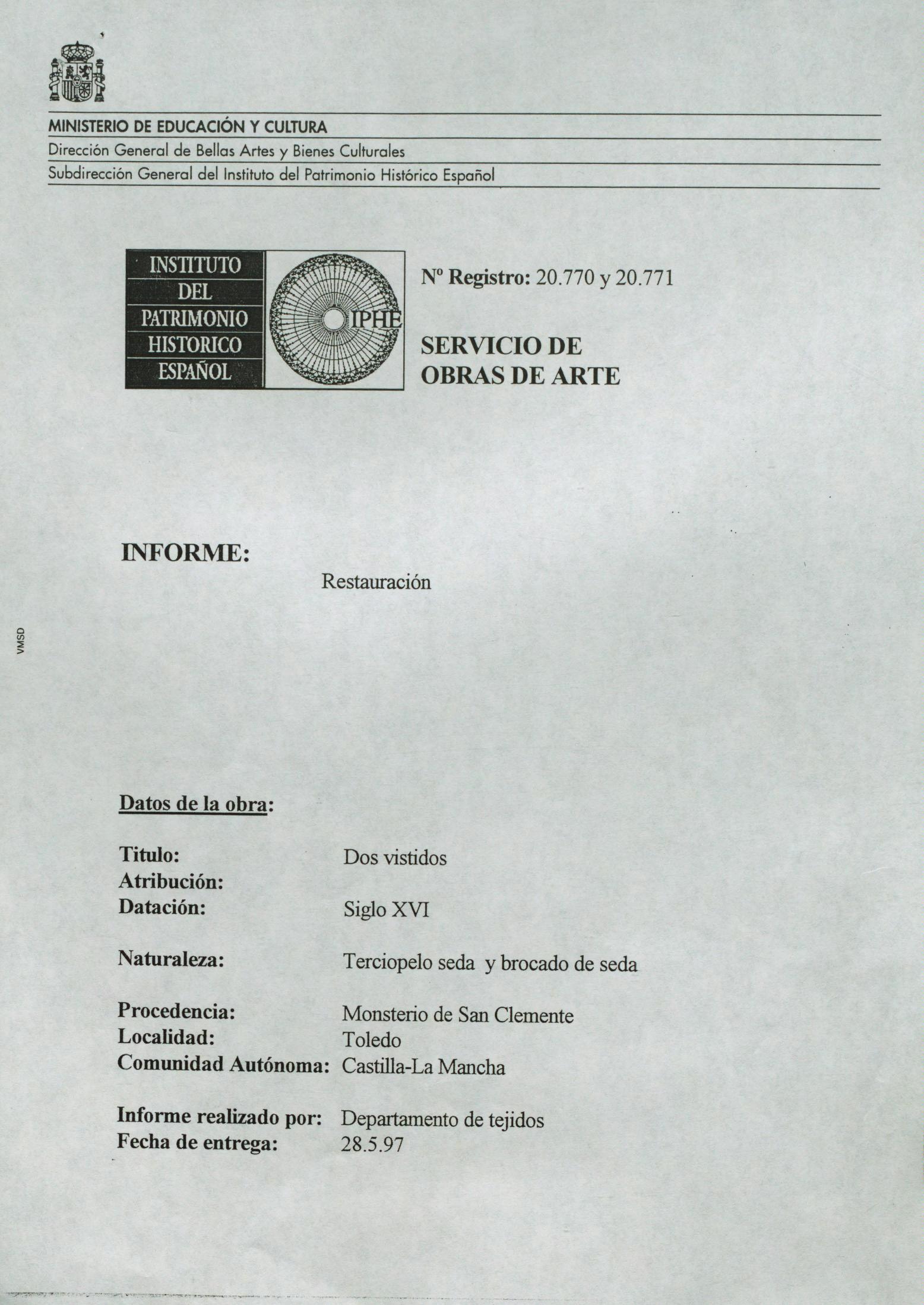 Restauración de dos vestidos del siglo XVI procedentes del Convento de San Clemente (Toledo)