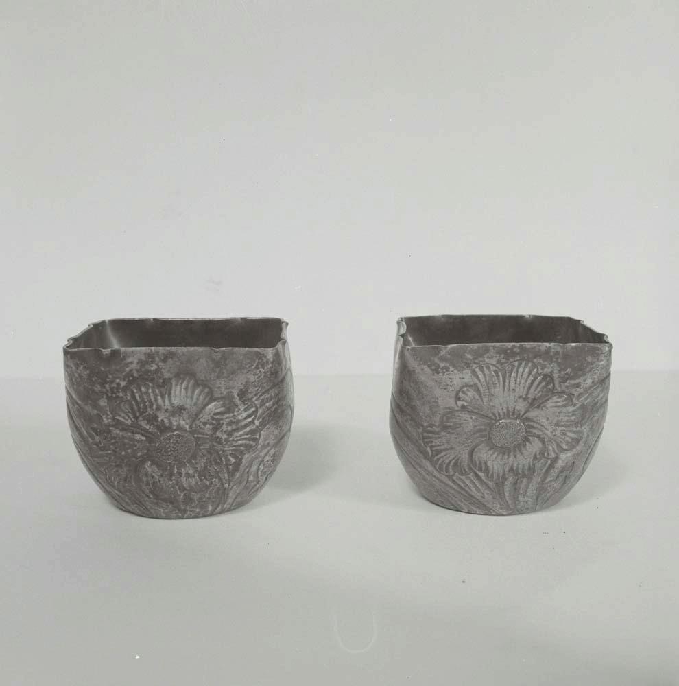 Restauración de un lavafrutas, de latón plateado, redondo con boca cuadrada y decoración floral repujada en uno de los lados, de la marca "Nappas" procedente del Servicio Nacional de Recuperación Artística (Madrid)