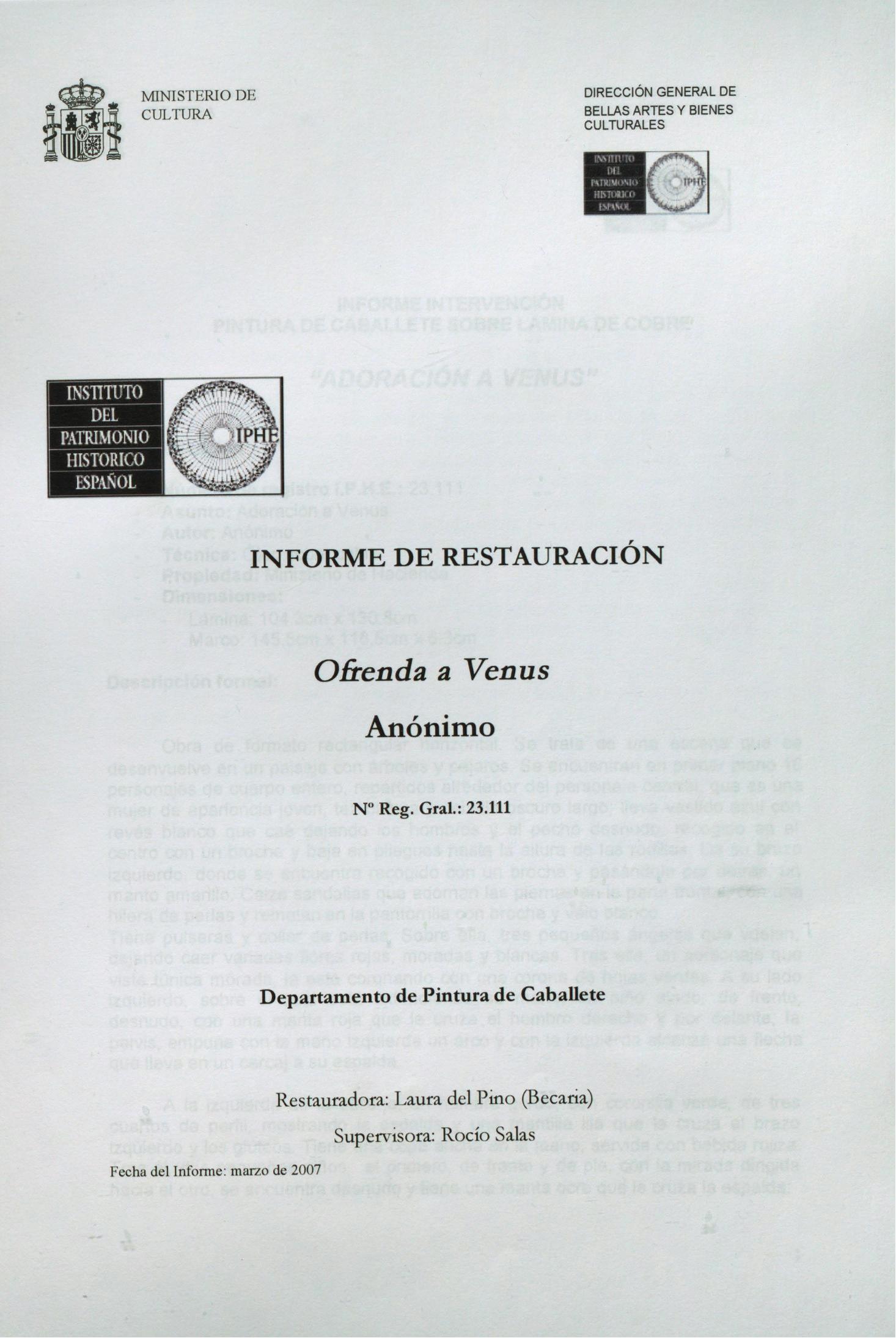 Restauración de la pintura sobre cobre "Ofrenda a Venus o Bacanal", procedente del Ministerio de Economía y Hacienda (Madrid)