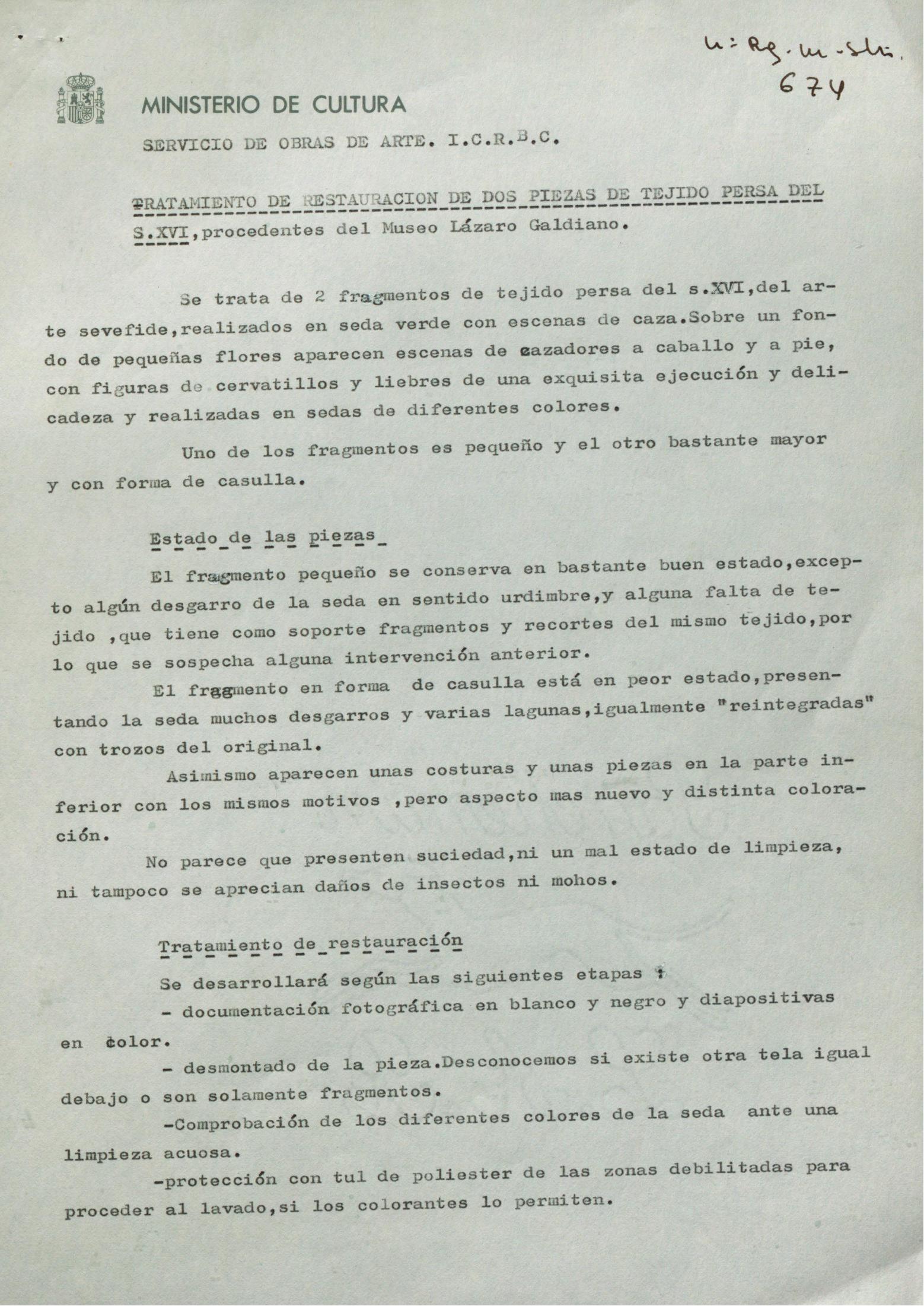 Informe de conservación y propuesta de tratamiento de dos piezas de tejido persa del siglo XVI, procedentes del Museo Lázaro Galdiano (Madrid)