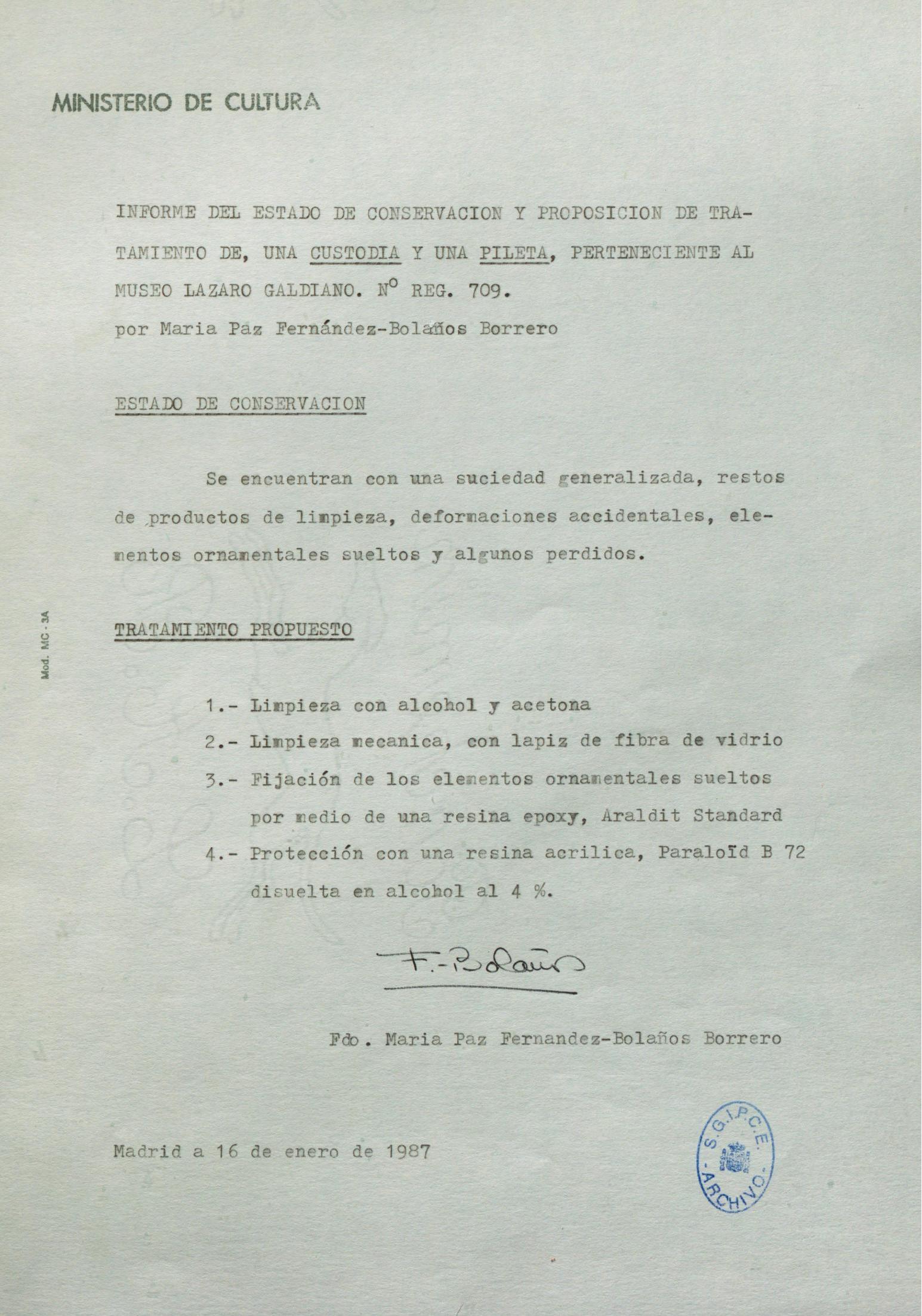 Informe de conservación de una custodia y una pileta procedentes de la Fundación Lázaro Galdiano (Madrid)