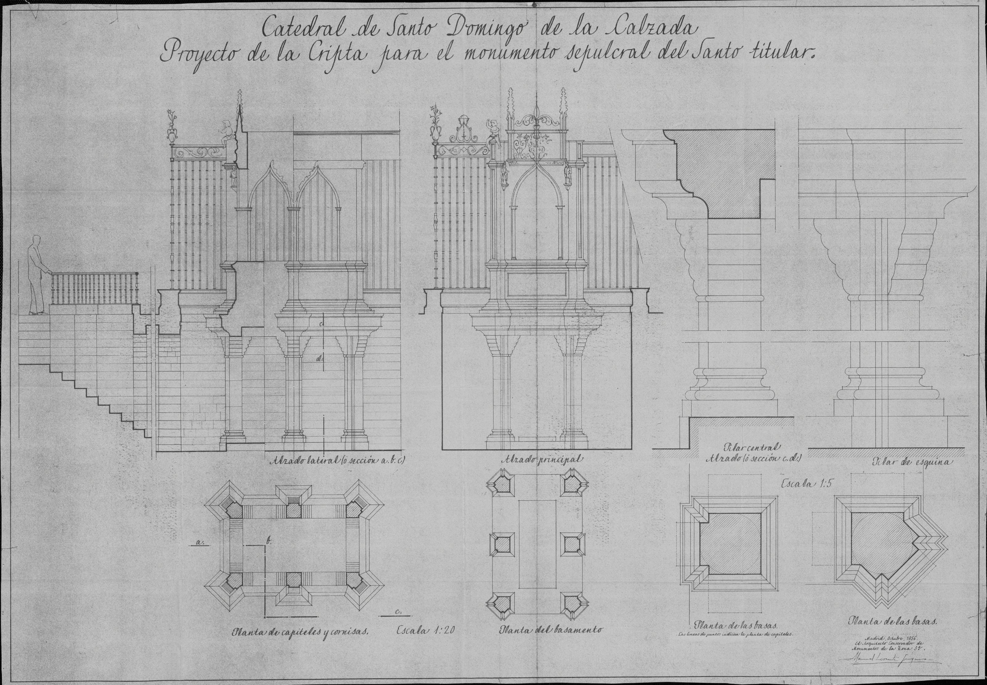 Catedral de Santo Domingo de la Calzada. Proyyecto de la Cripta para el monumento sepulcral del Santo titular: Alzado lateral. Alzado principal. Pilar Central. Pilar de esquina. Planta de capiteles y cornisas. Planta del basamento. Planta de las basas.