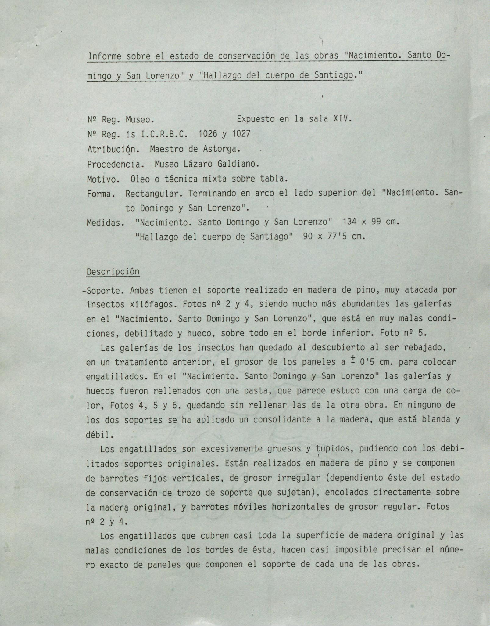 Informe de conservación de las tablas "Retablo de la Natividad con Santo Domingo y San Lorenzo" y "Desembarco del Cuerpo de Santiago Apóstol", del Maestro de Astorga, procedentes del Museo Lázaro Galdiano (Madrid)