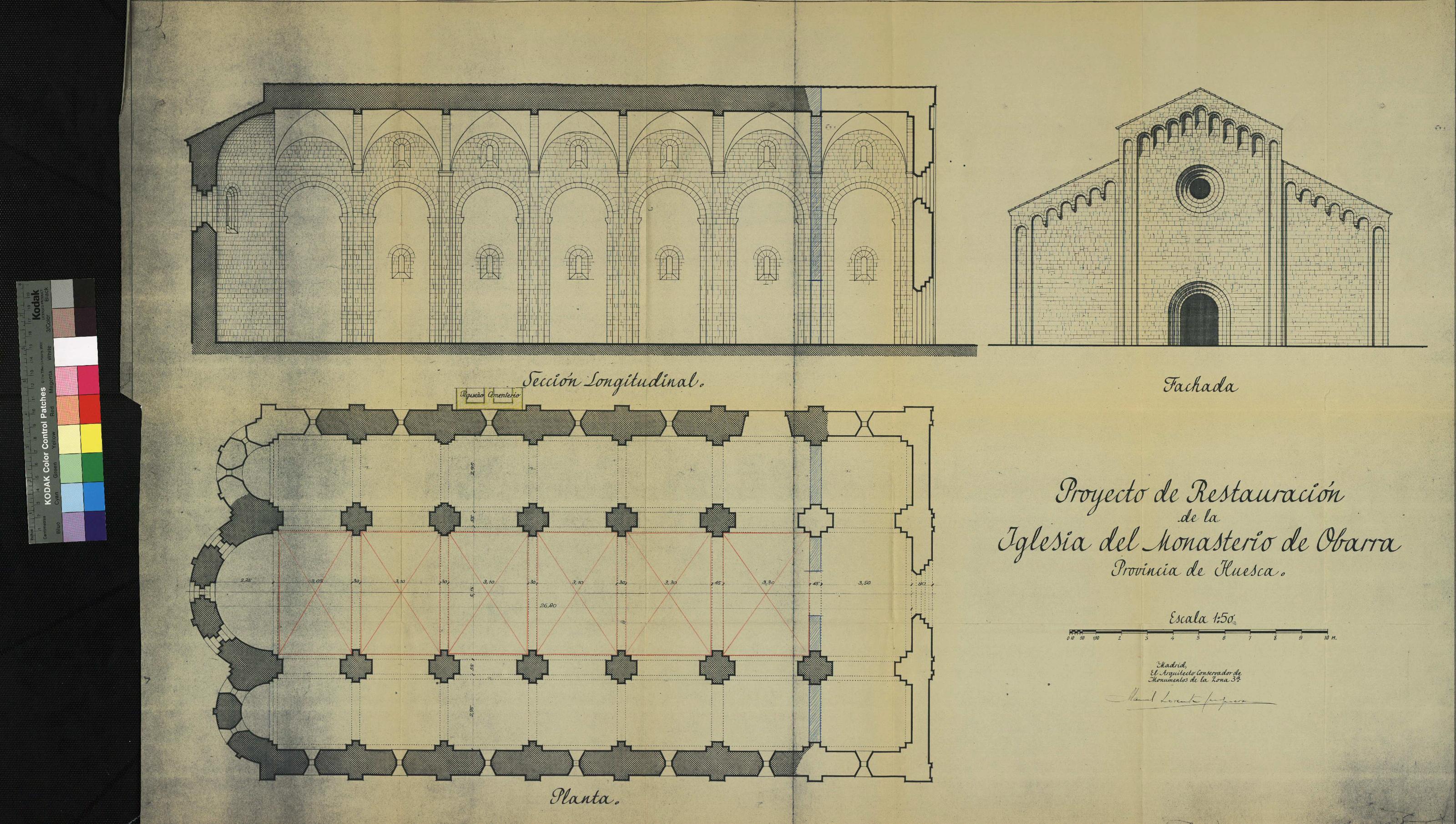 Proyecto de Restauración de la Iglesia del Monasterio de Obarra: Planta Sección Longitudinal Fachada
