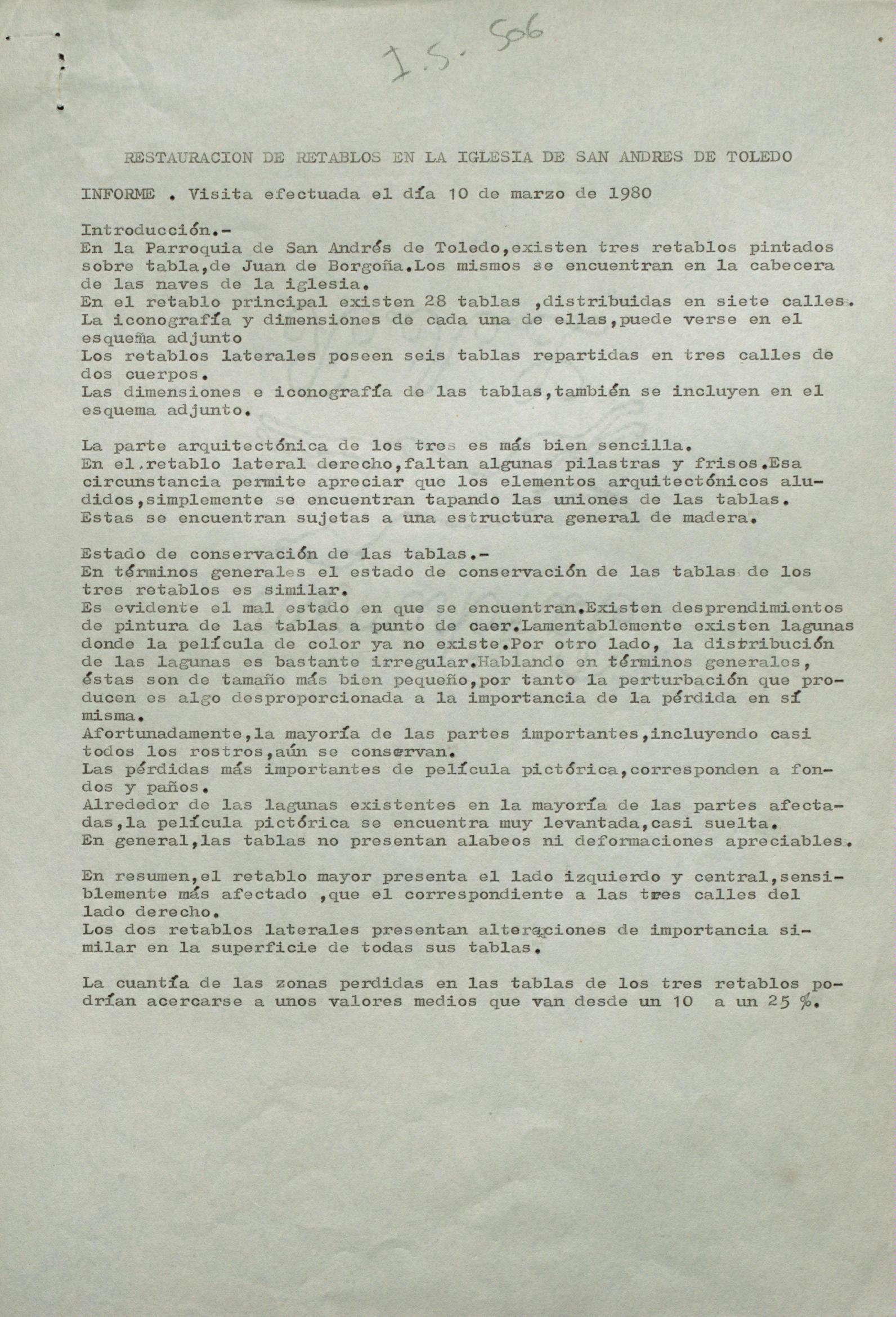 Informe de visita sobre la restauración de tres retablos de Juan de Borgoña procedentes de la Iglesia de San Andrés (Toledo)